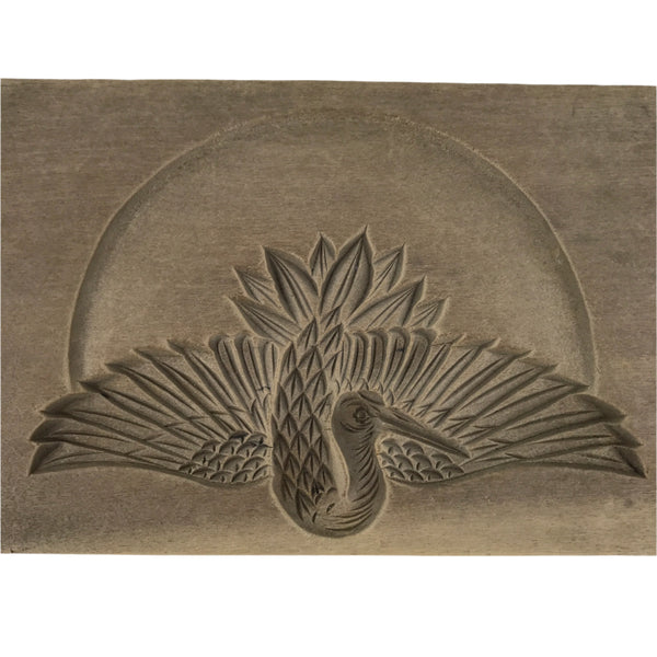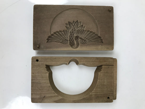 This two-panel kashigata mold is carved with the design of a bird, likely a Japanese crane (tsuru). It is placed in front of a rising sun. This mold can be used to make sweets or as an eye-catching decorative item.