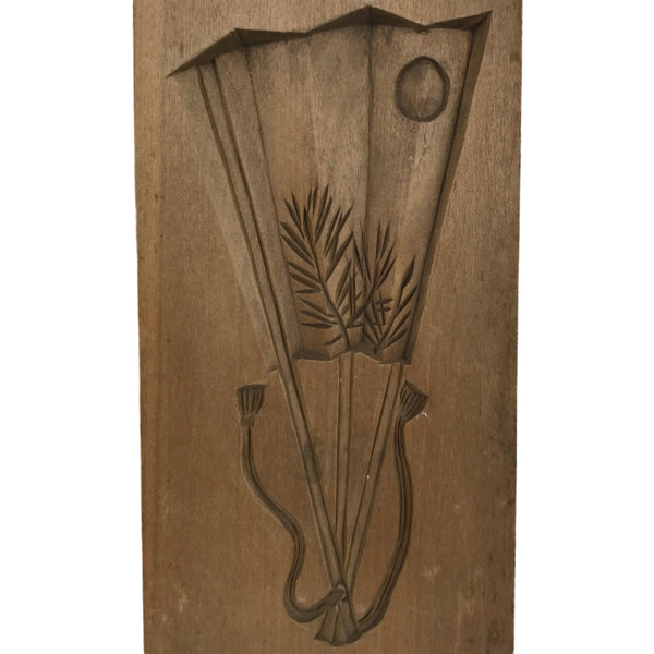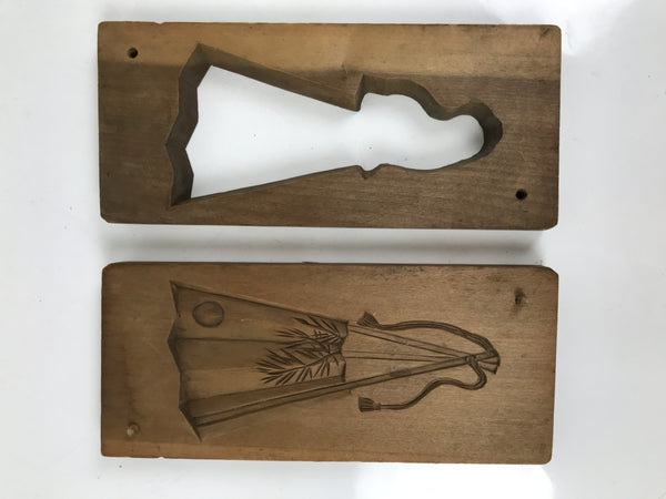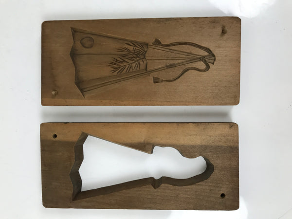 This two-panel kashigata mold is carved with the design of a partially folded fan (sensu) with a moon and pampas grass (susuki). It has a tsukimi, or moon viewing theme, which is a day that honors the autumn moon or celebrates a mid-autumn festival. This mold can be used to make sweets or as an eye-catching decorative item.
