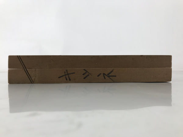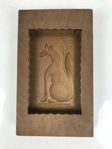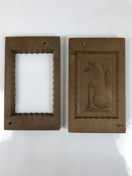 This two-panel kashigata mold is carved with the design of a fox (kitsune) sitting in front of a temple gate/torii. It is set in a scalloped frame. This mold can be used to make sweets or as an eye-catching decorative item.