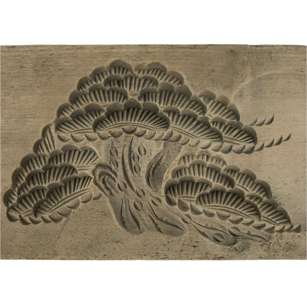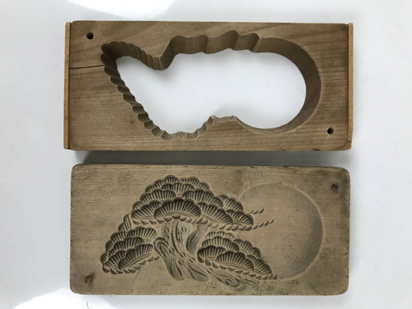 This two-panel kashigata mold is carved with the design of a full, manicured pine tree (matsu) with a rising sun to the side. This mold can be used to make sweets or as an eye-catching decorative item.
