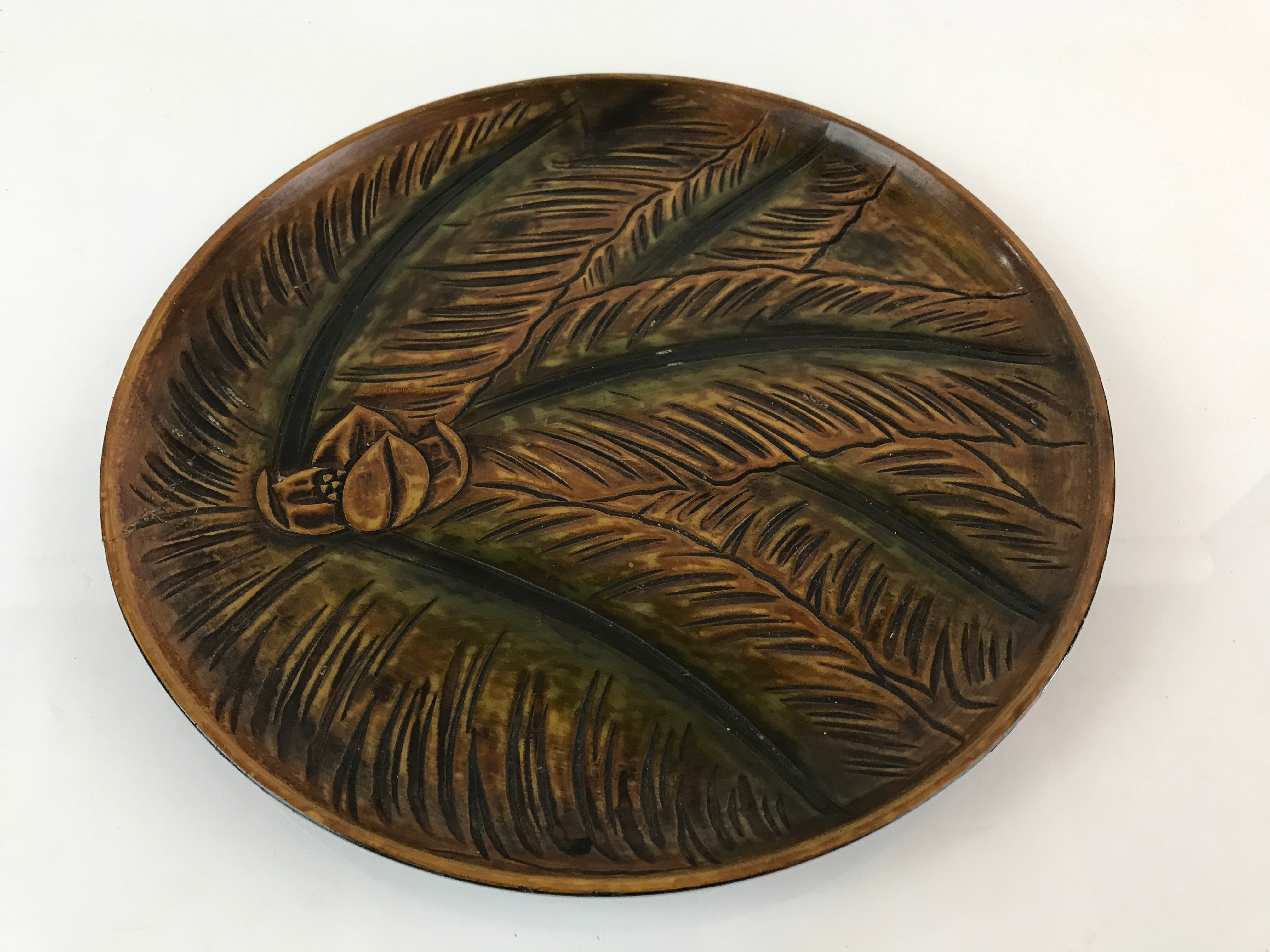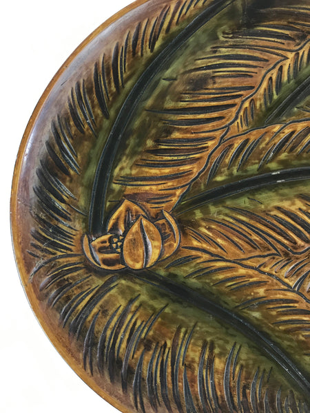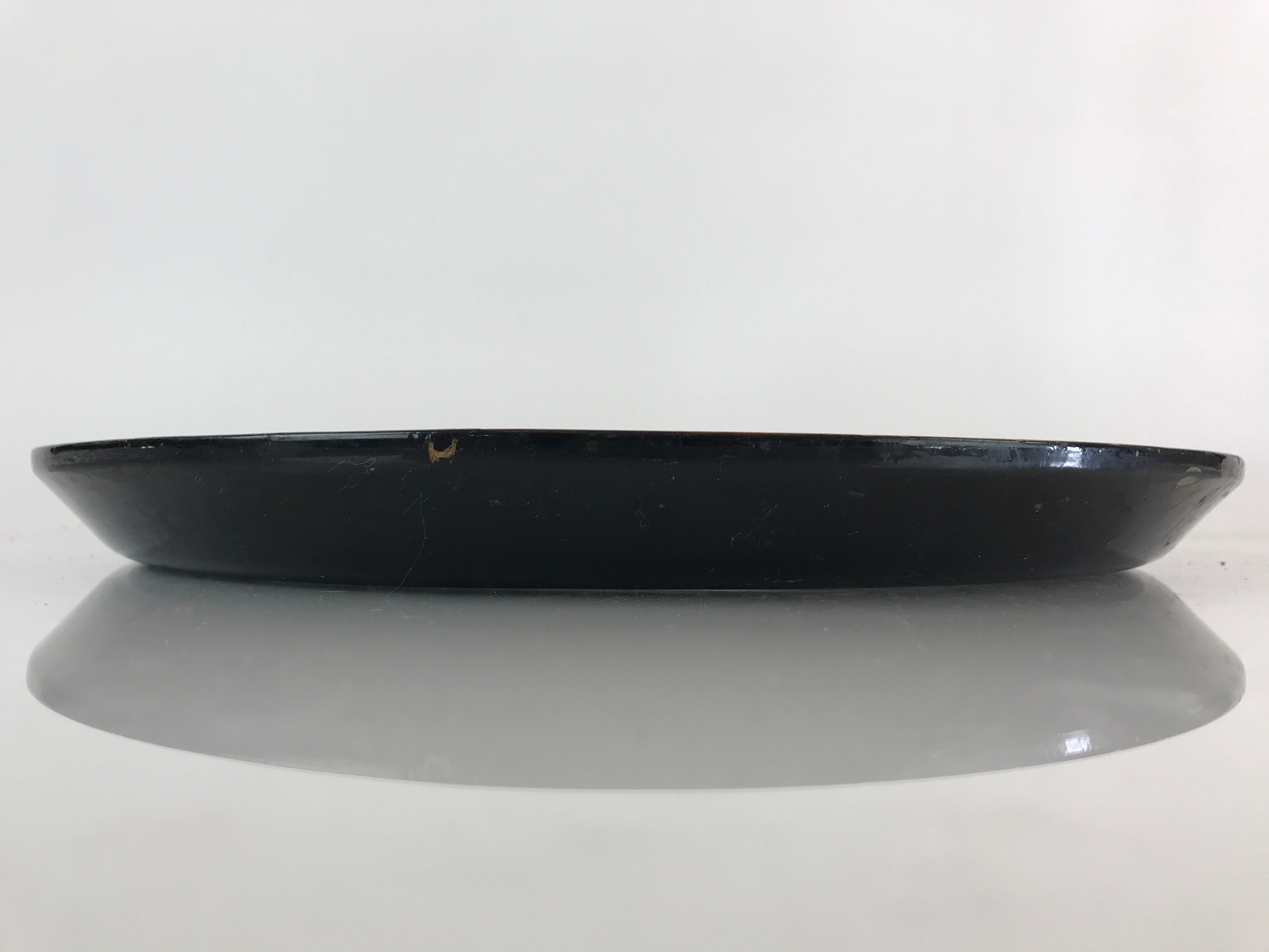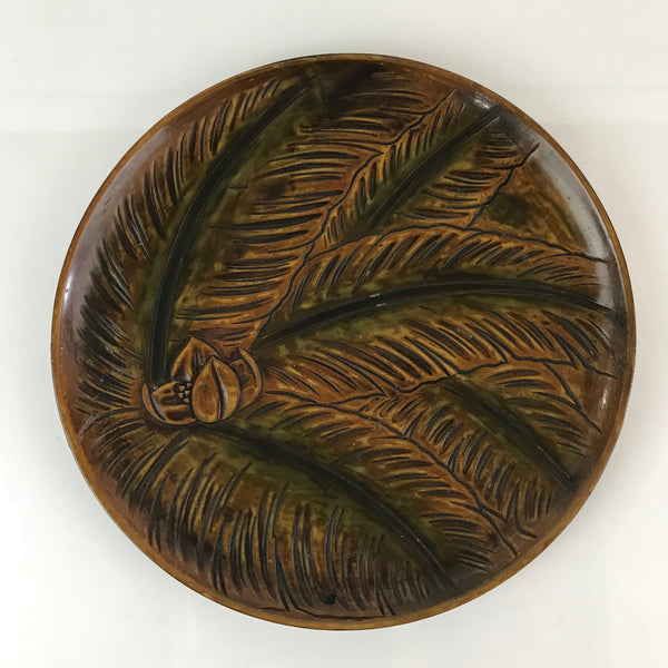 Japanese Wood Carving Tray Obon Vtg Round Wood Brown Leaf UR815