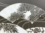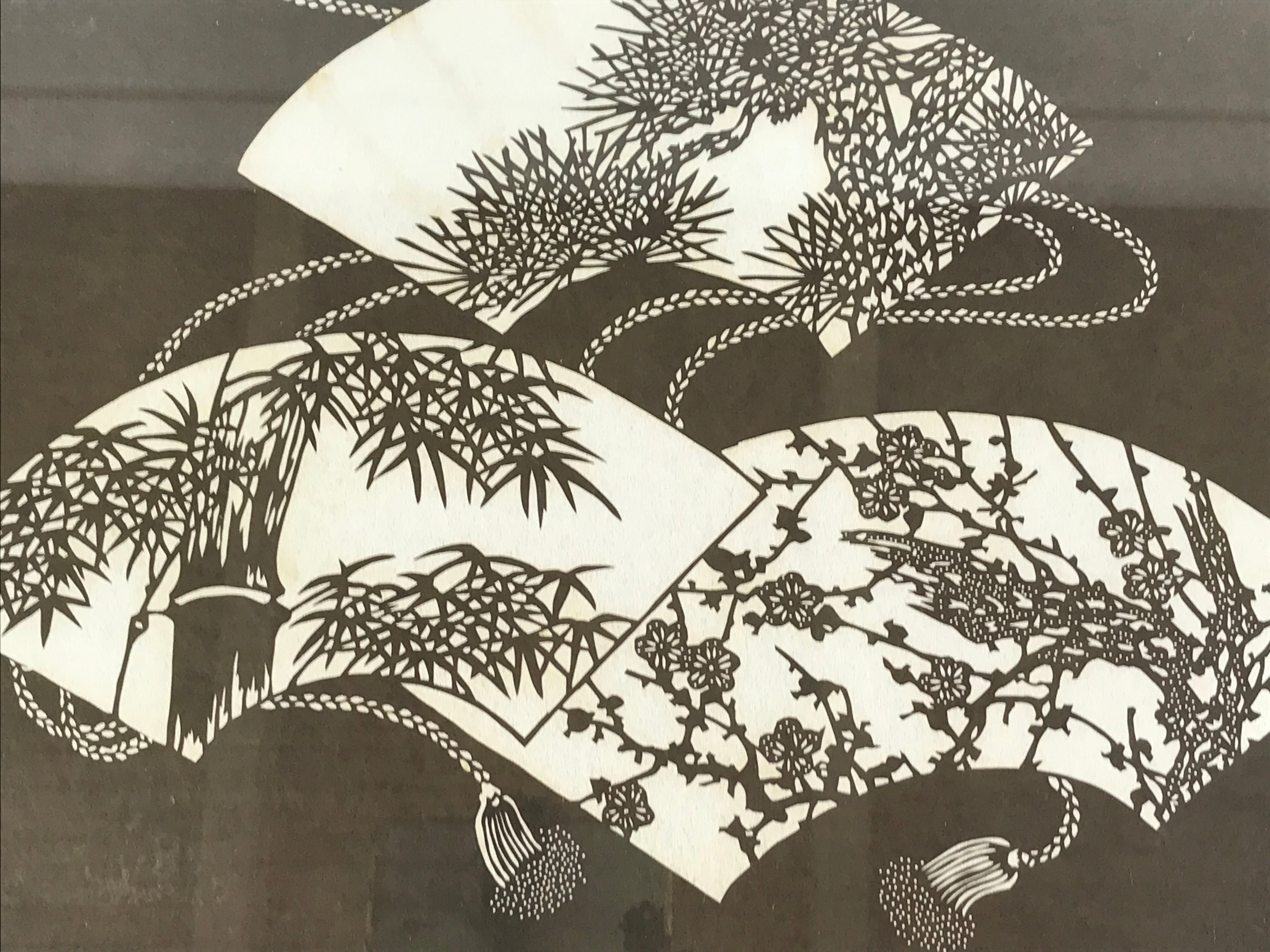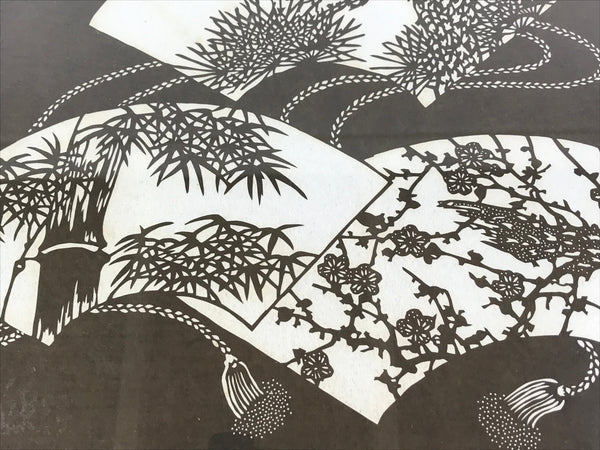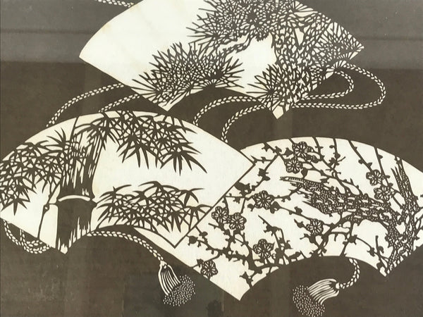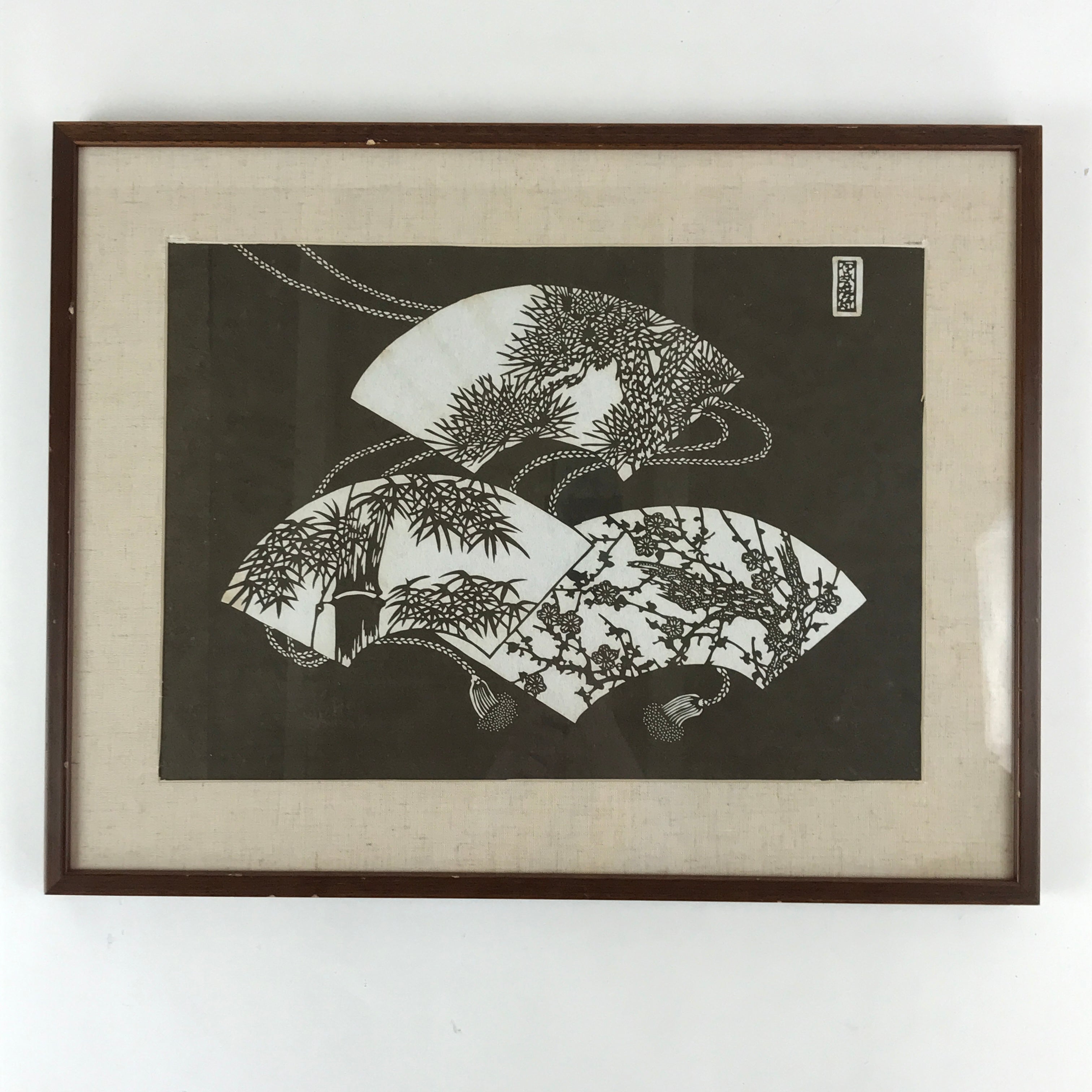 Vintage Japanese Katagami of Shochikubai Patterned Fans w/ Wood Frame