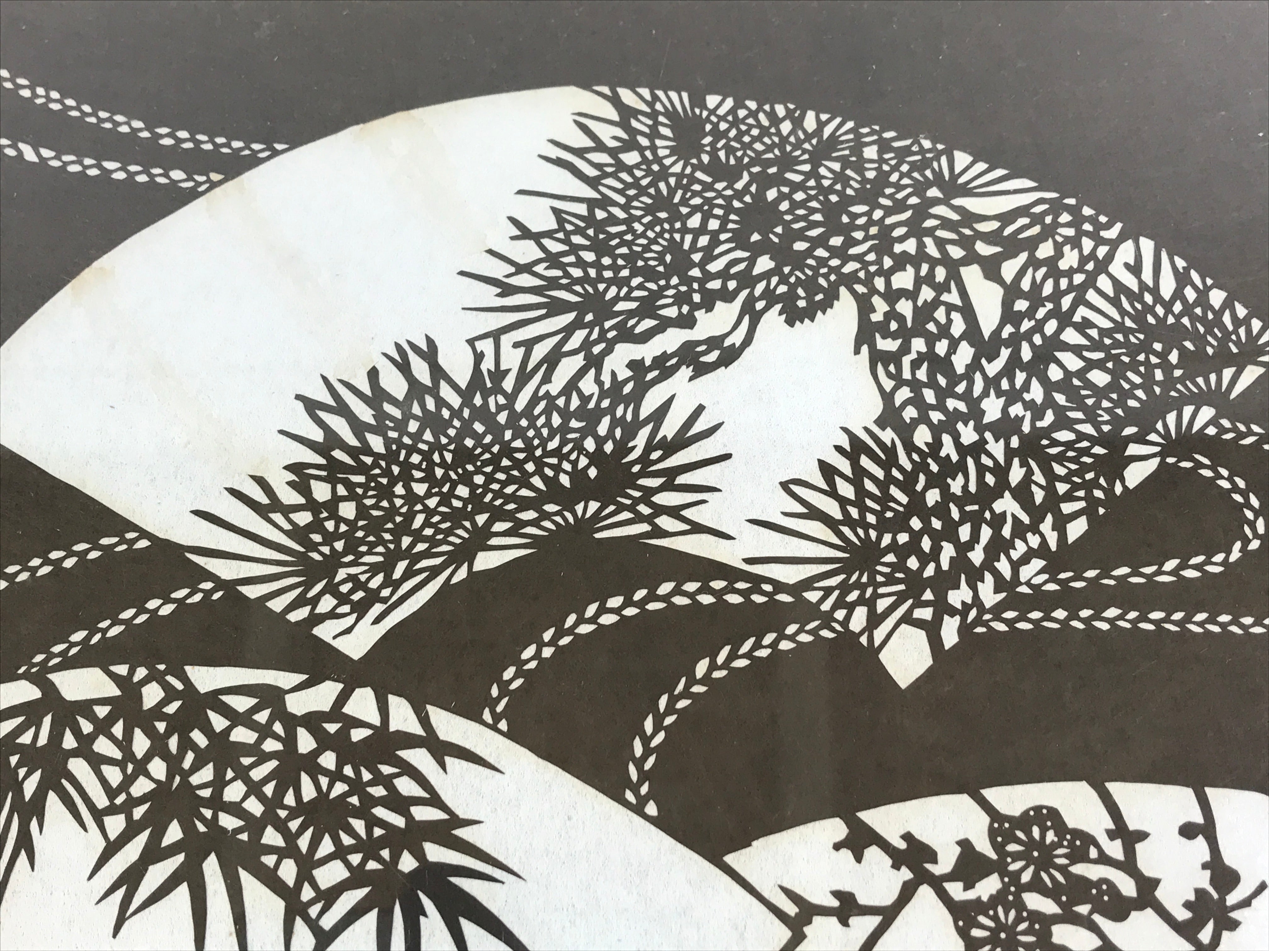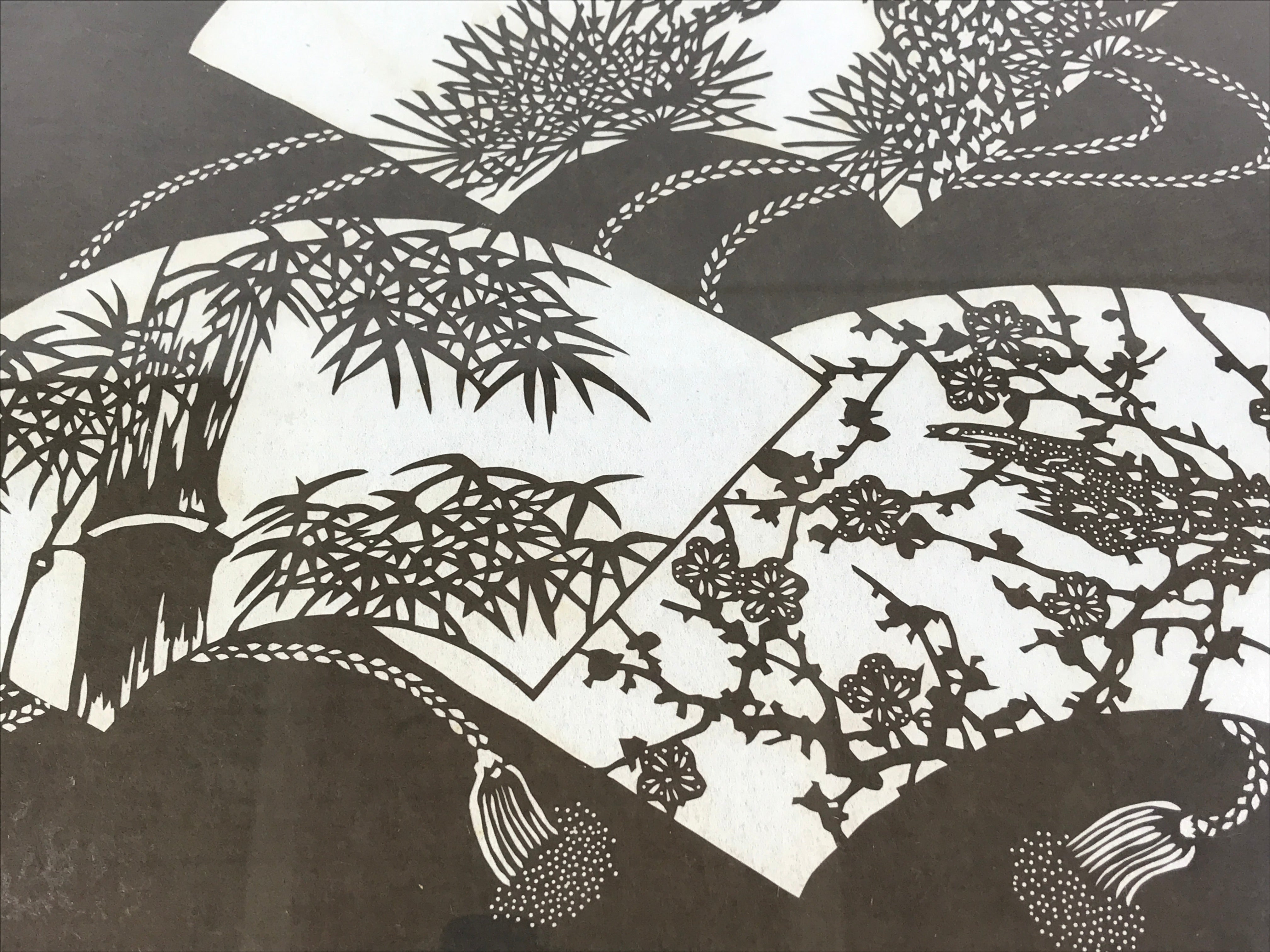 In a simple brown wood frame, this Ise katagami textile stencil made from mulberry paper displays the image of three fans. Together, the fans have a shochikubai pattern, a traditional set of imagery that includes pine, bamboo, and plum blossom. It is a common association with New Year and the winter season as it symbolizes perseverance and renewal.
