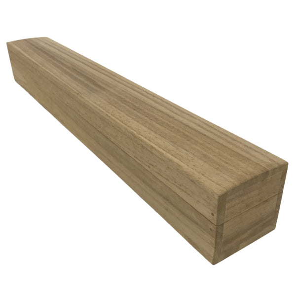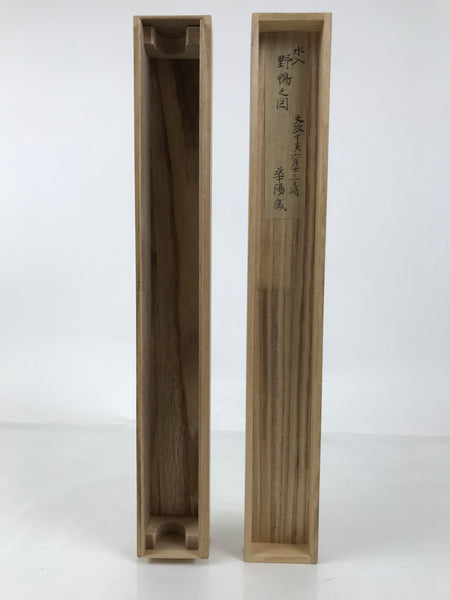 Hand-crafted and in a natural wood color, this sturdy, slender box is made to store a hanging scroll, or kakejiku. The lid fits flush on the top. It has two carved wooden brackets attached to the inside used to keep a scroll in place. The paper inside reads that the scroll would have been a picture of wild ducks from Bunsei 10 (1827), June 23rd. Due to the construction of the box, this would have been one for a modern reproduction.