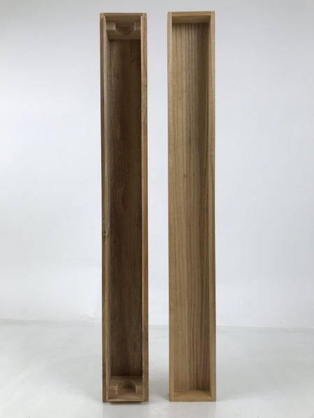 Hand-crafted and in a natural wood color, this sturdy, slender box is made to store a hanging scroll, or kakejiku. The lid fits flush on the top. It has two carved wooden brackets attached to the inside used to keep a scroll in place.