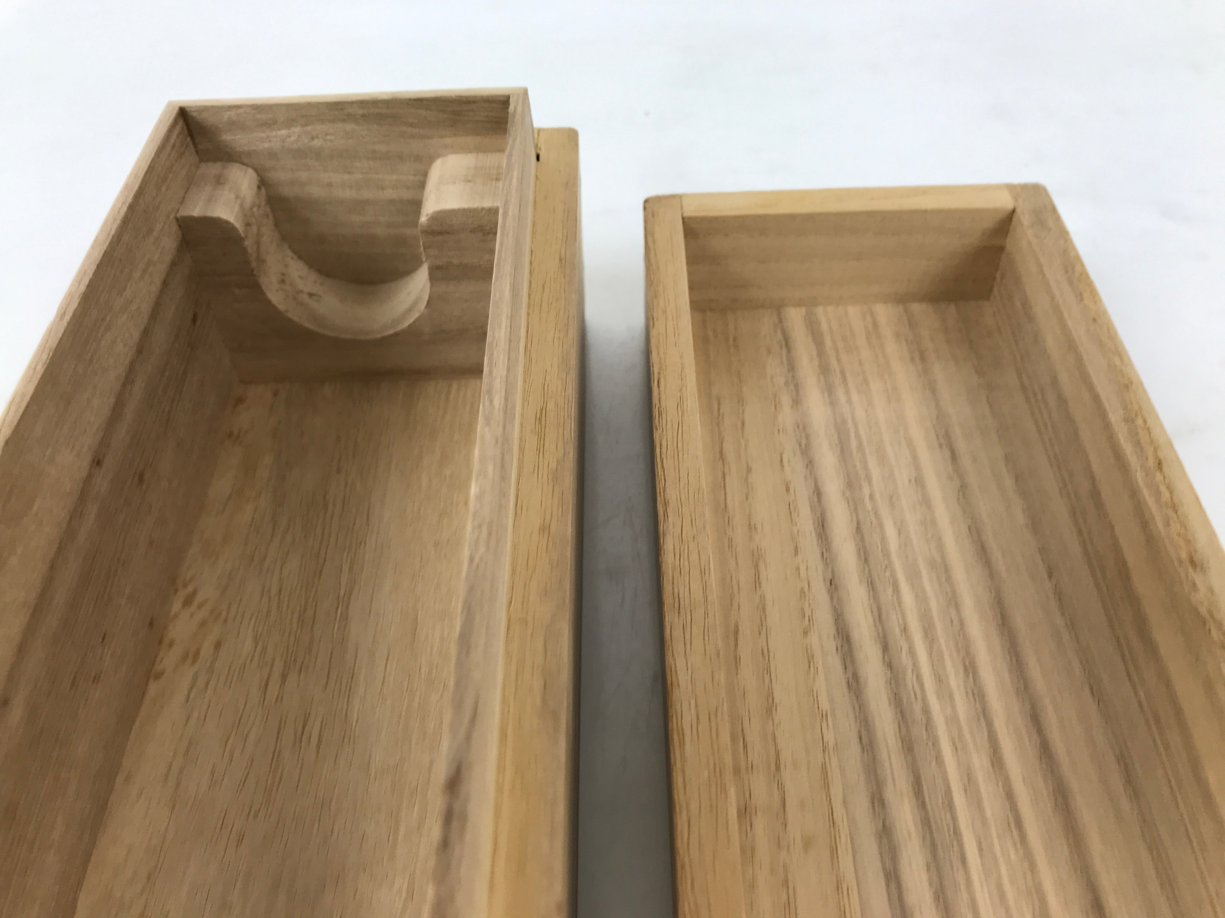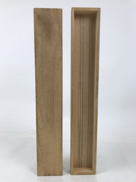 Hand-crafted and in a light brown color, this sturdy, slender wooden box is made to store a hanging scroll, or kakejiku. The lid fits flush on the top. It has two carved wooden brackets attached to the inside used to keep a scroll in place.