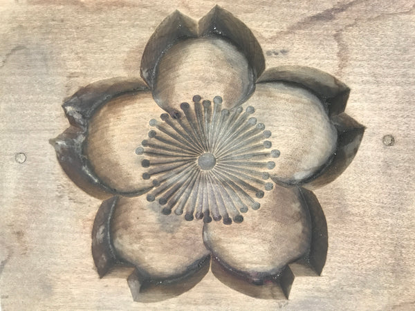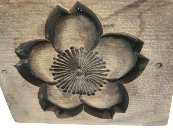 This single panel kashigata mold is carved with the design of a large cherry blossom (sakura). The back side has a lines pattern. This mold can be used to make sweets or as an eye-catching decorative item.