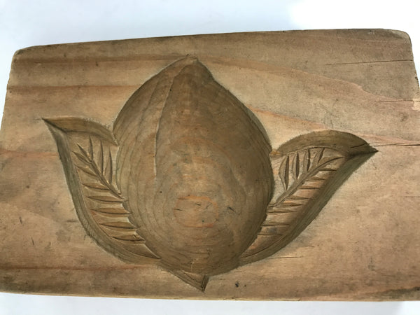 This single panel kashigata mold is carved with the design of a peach with leaves (momo). This mold can be used to make sweets or as an eye-catching decorative item.