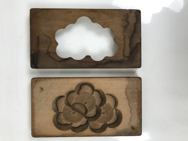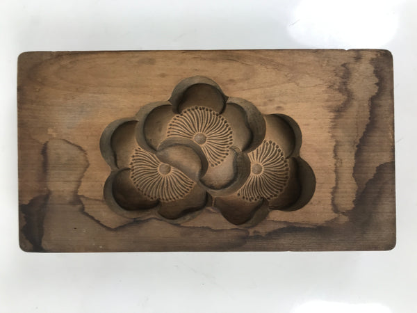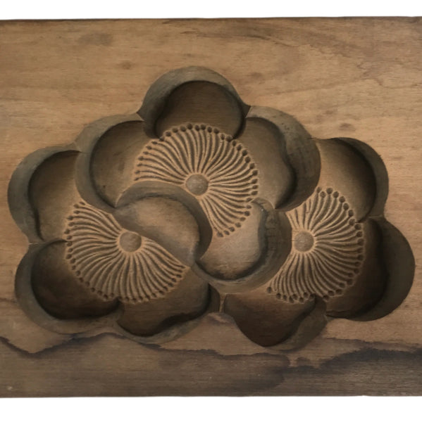 This two-panel kashigata mold is carved with the design of three large plum blossoms (ume). This mold can be used to make sweets or as an eye-catching decorative item.