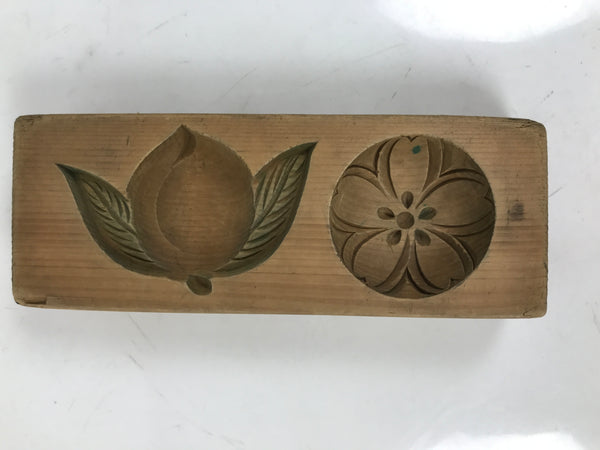 This single panel kashigata mold is carved with the design of a peach with leaves (momo) and a cherry blossom (sakura). This mold can be used to make sweets or as an eye-catching decorative item.