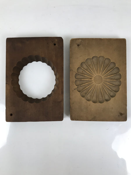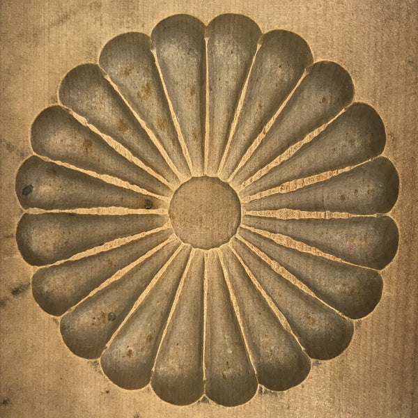 This two-panel kashigata mold is carved with the design of a detailed chrysanthemum (kiku). Not only is the chrysanthemum a symbol of the Japanese Imperial family, but it represents longevity and rejuvenation. This mold can be used to make sweets or as an eye-catching decorative item.