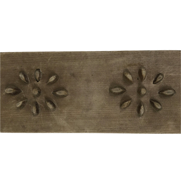 This two-panel kashigata mold is carved with the design of two cut cross-sections of lotus root (renkon), a popular root vegetable used in Japanese cooking. This mold can be used to make sweets or as an eye-catching decorative item.