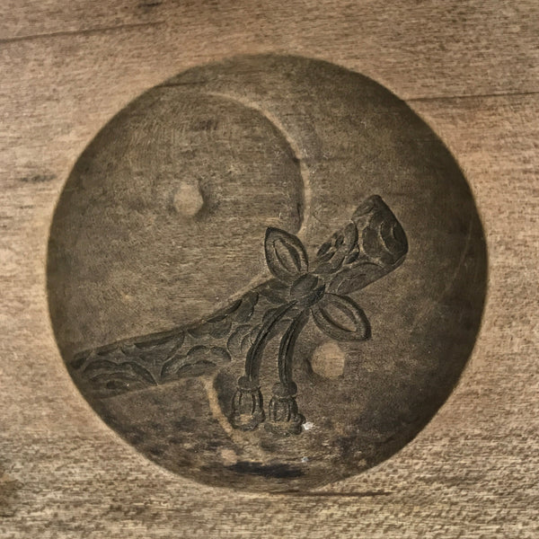 This two-panel kashigata mold is carved with the design of a yin yang (inyou/onyou) with what appears to be the head of a staff with a cord tied around it. This mold can be used to make sweets or as an eye-catching decorative item.