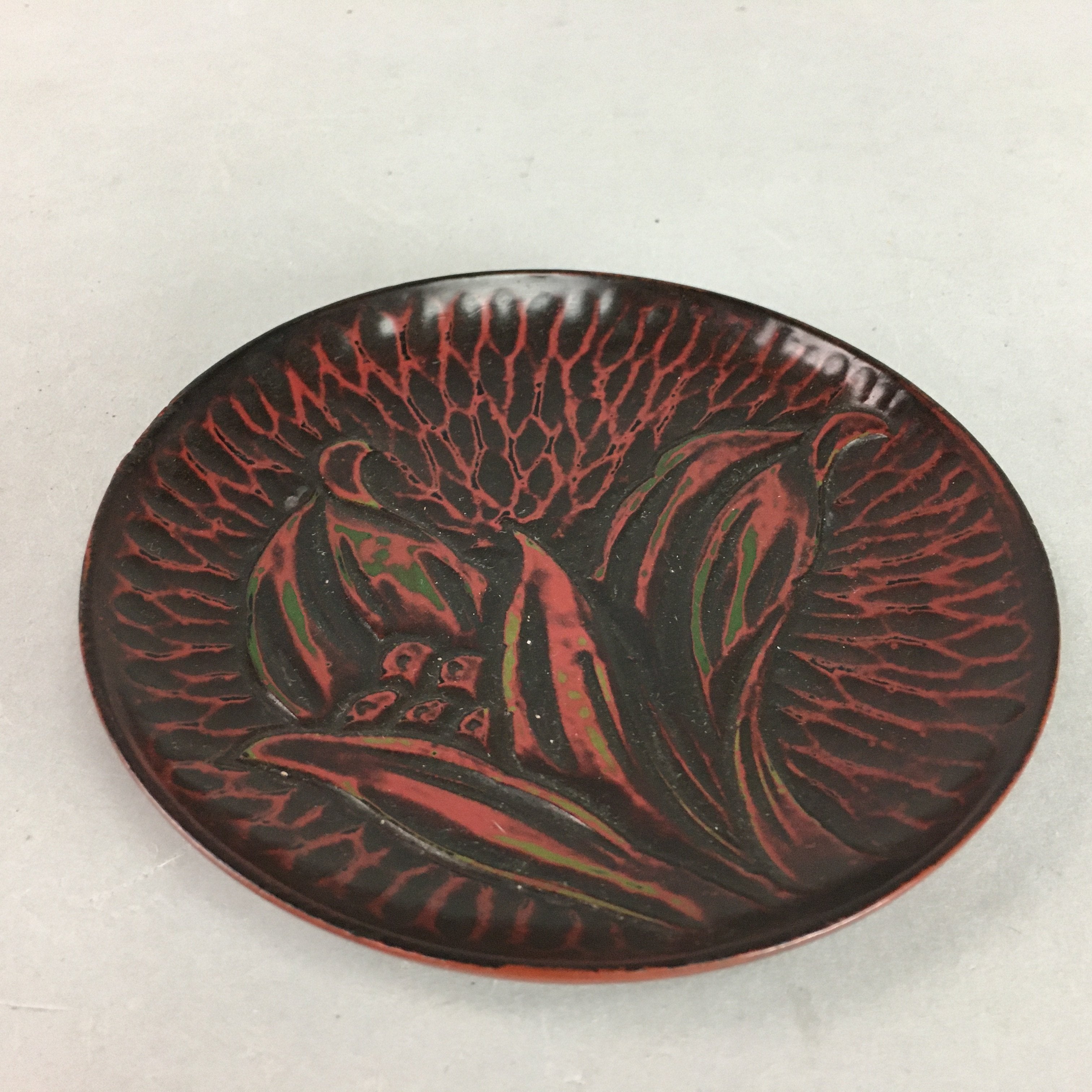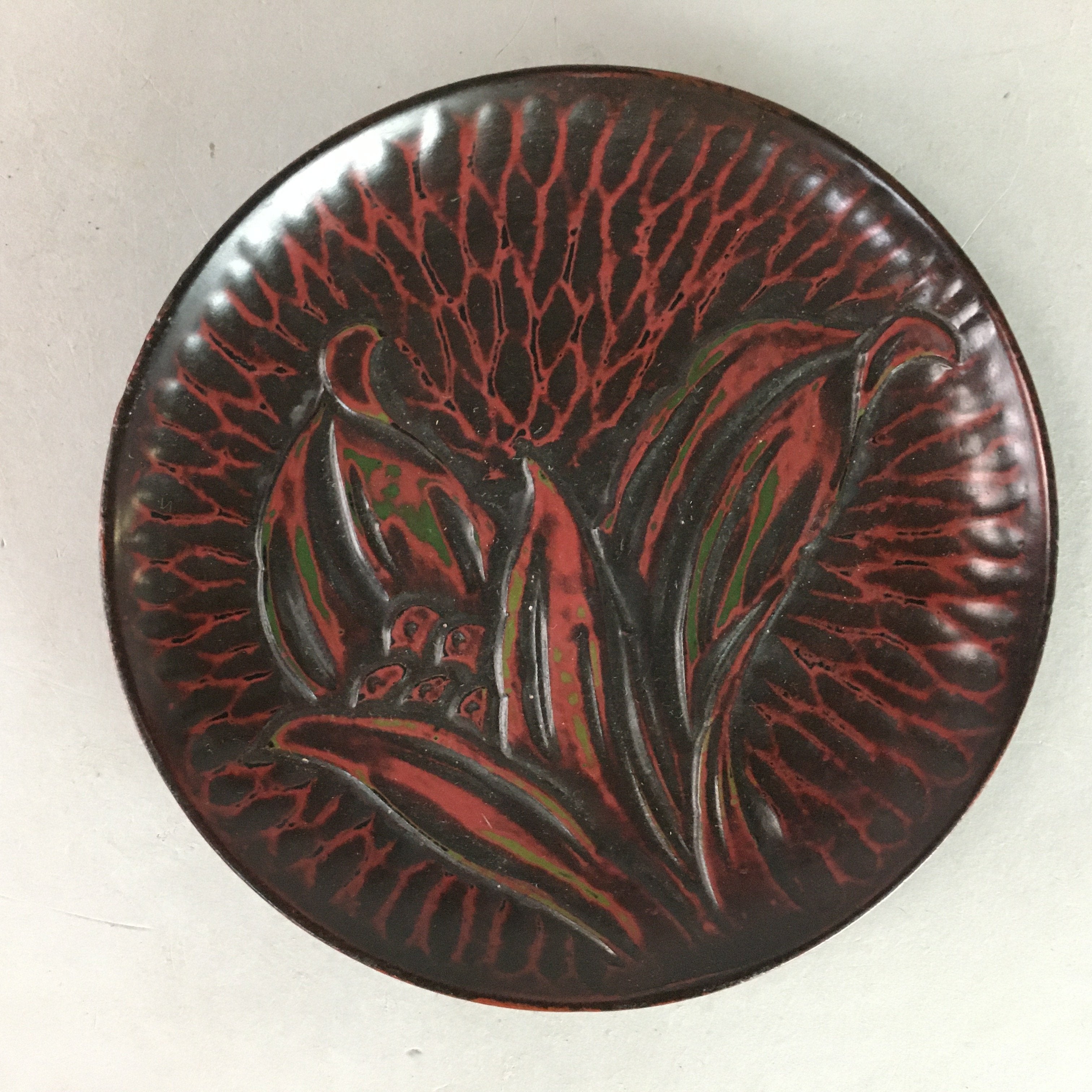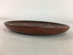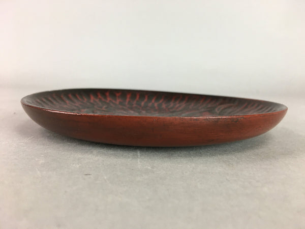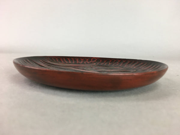 Japanese Wood Lacquer Plate Kamakura-Bori Vtg Brown Hand-carved Floral UR243
