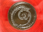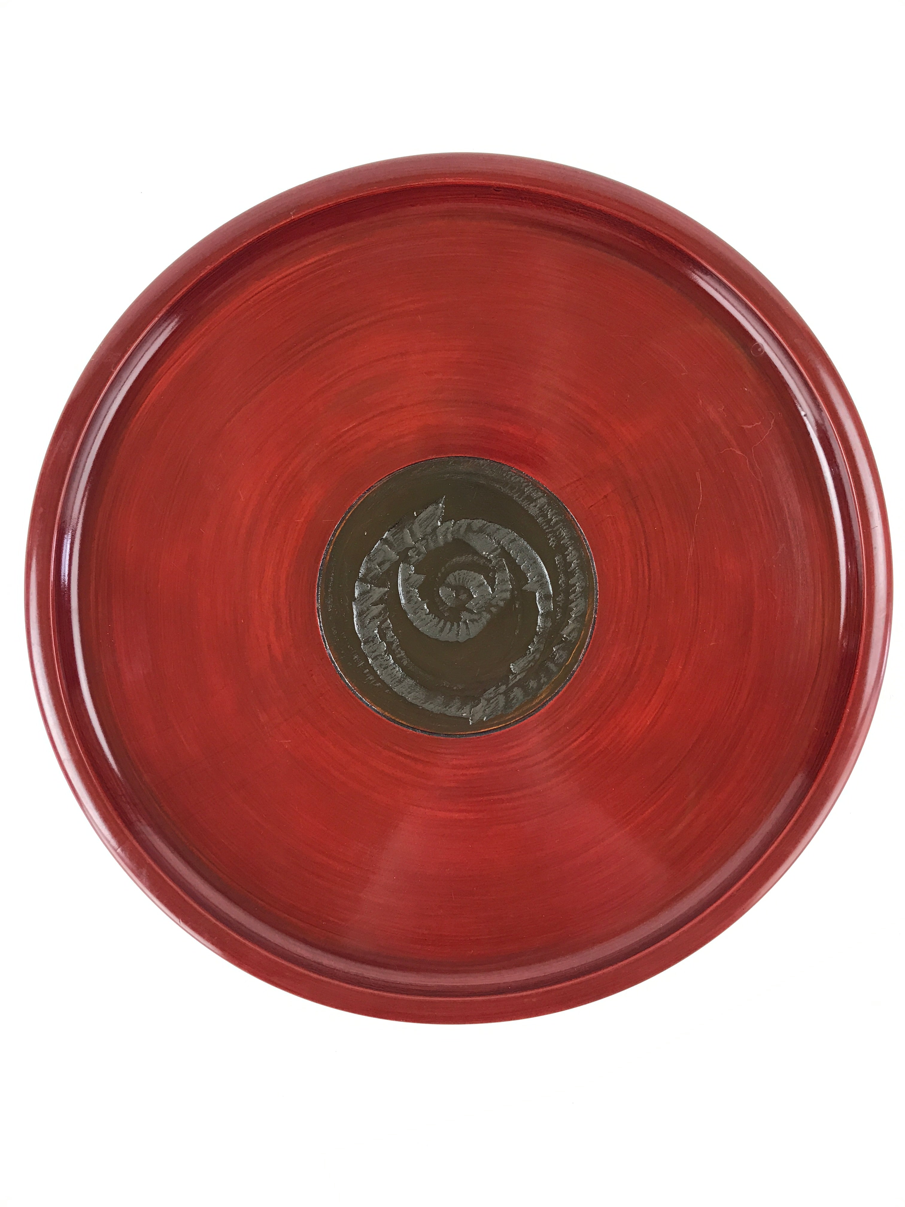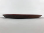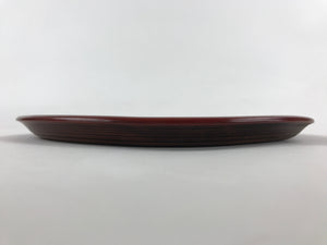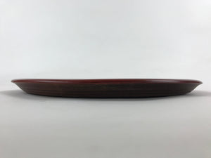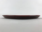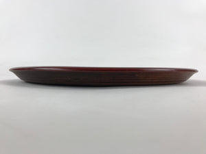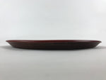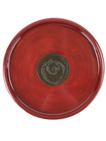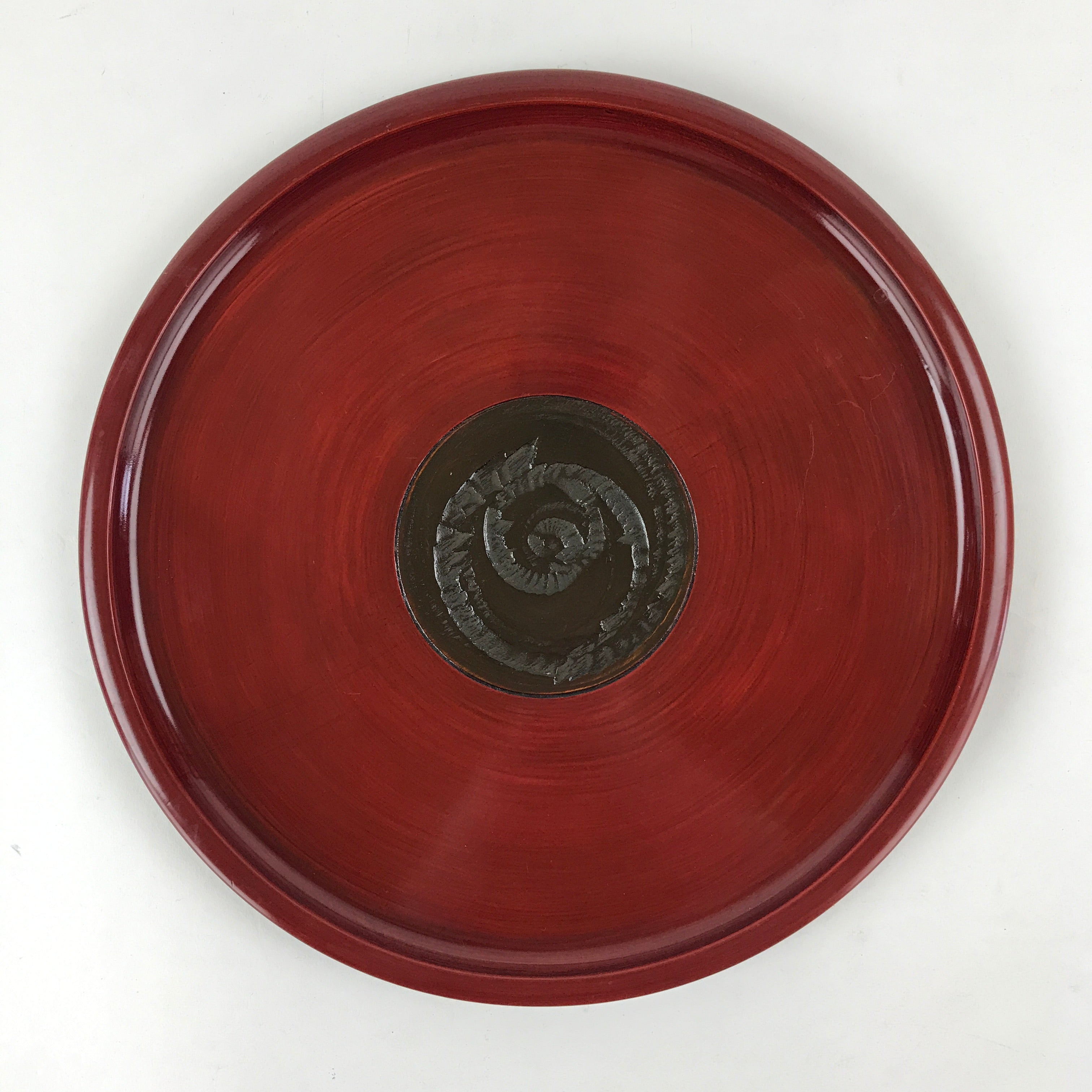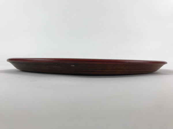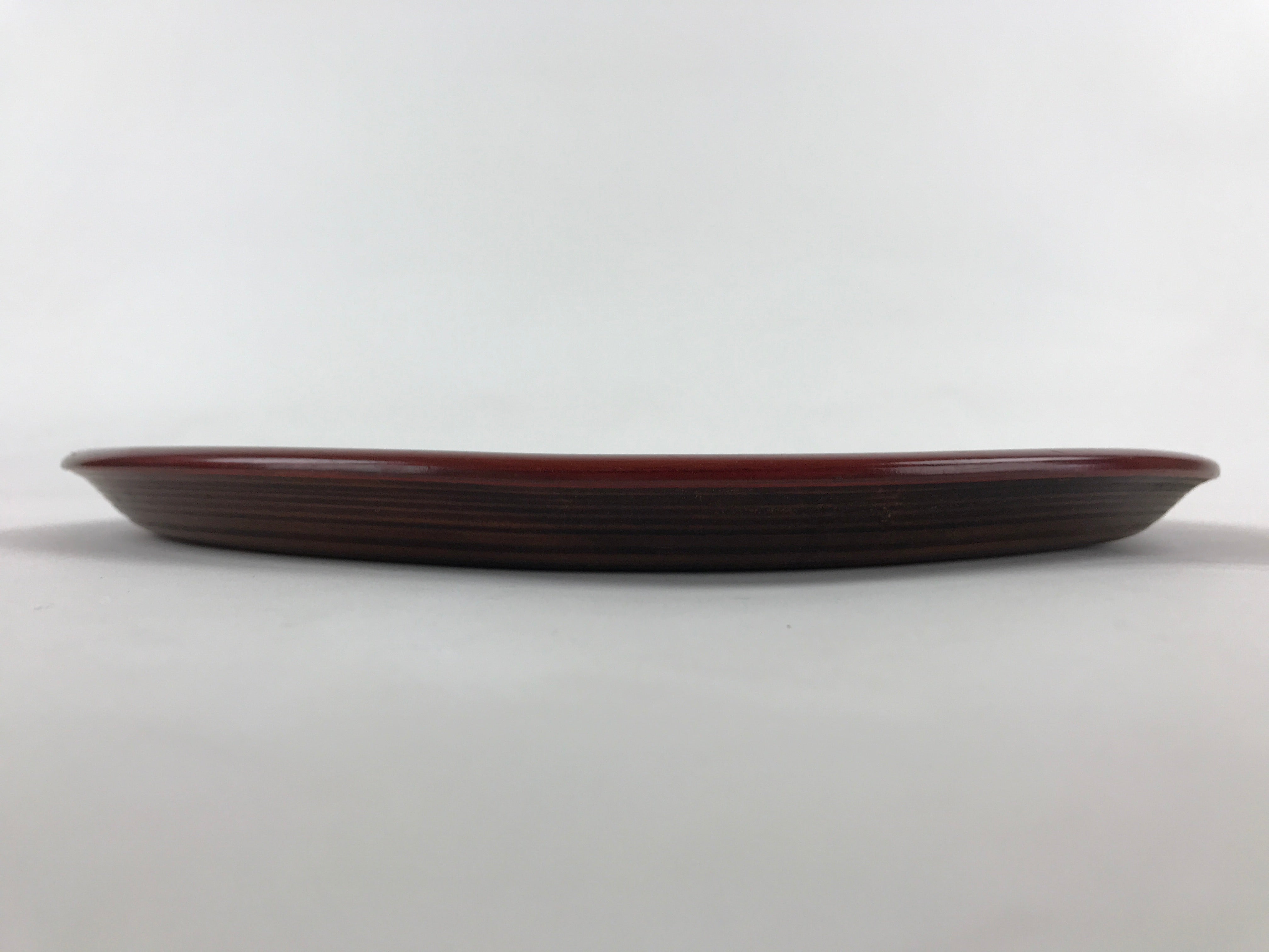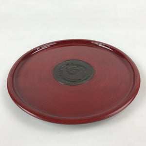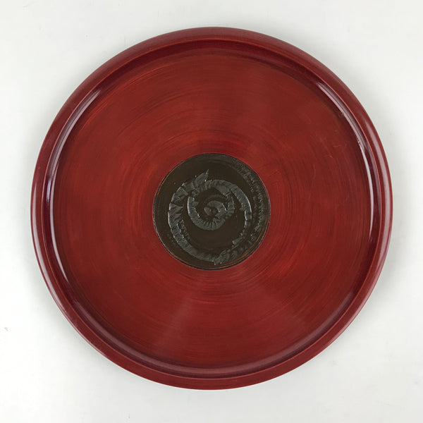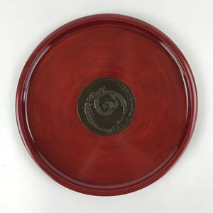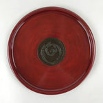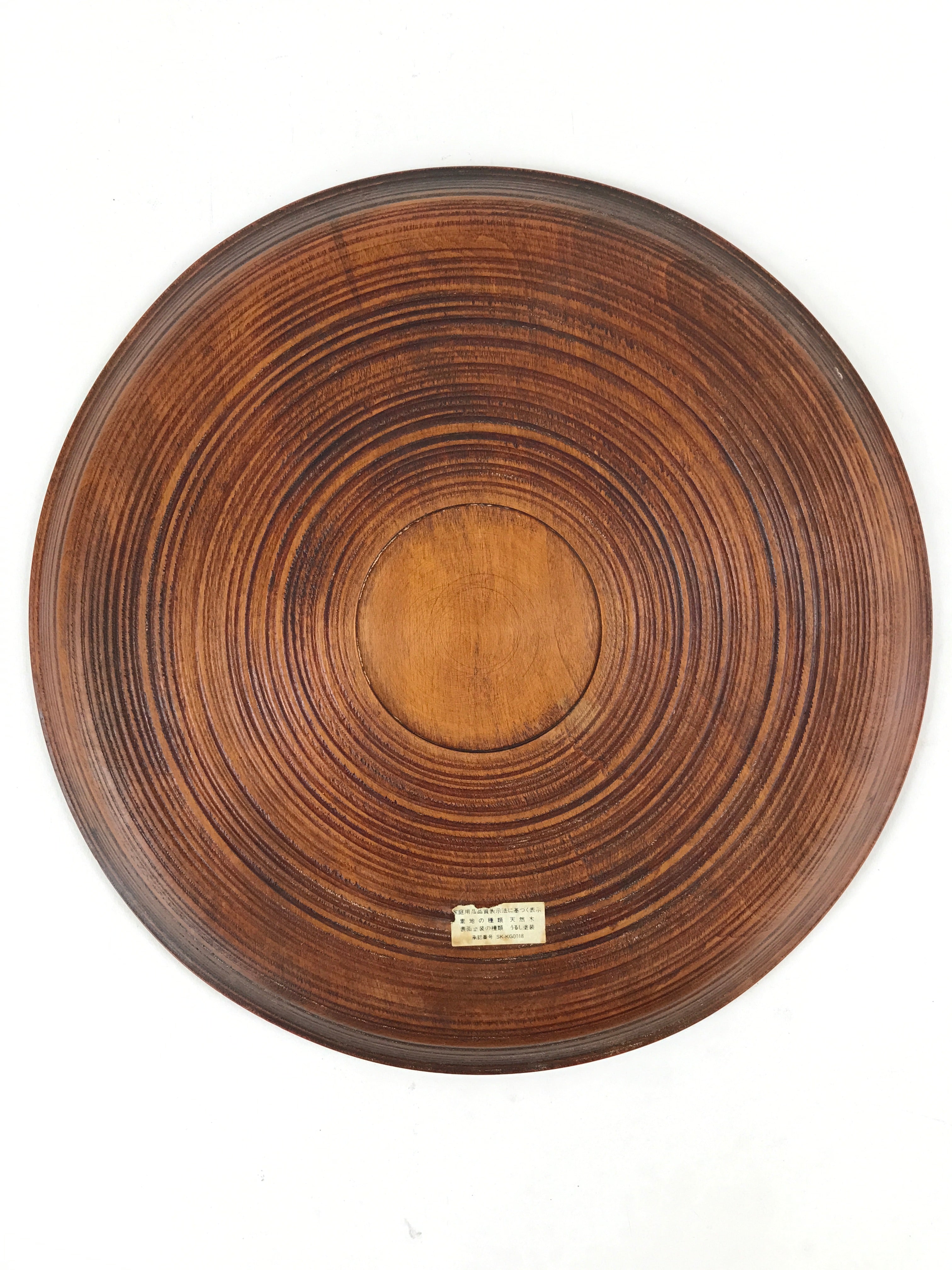 This is a Japanese vintage wooden lacquered tray, or Obon, typically used for serving drinks and snacks to guests in one's home, business, etc. Colored a glossy medium brown with lovely wood grain on display, this sturdy round tray provides both function and beautiful decor. It also features a carved image of a rosebud at the center in dark brown.