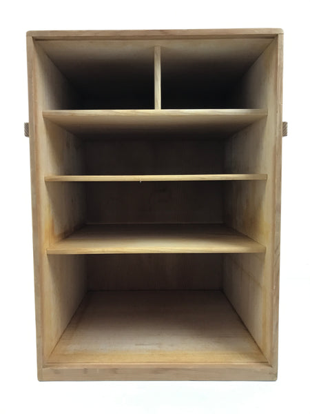 This lidded box is made of wood and has a natural wood color. It has five differently sized compartments and a sliding lid on the front. This box was originally used to store a set of pottery intended to serve kaiseki cuisine. It is excellent for general storage, DIY, or decoration.