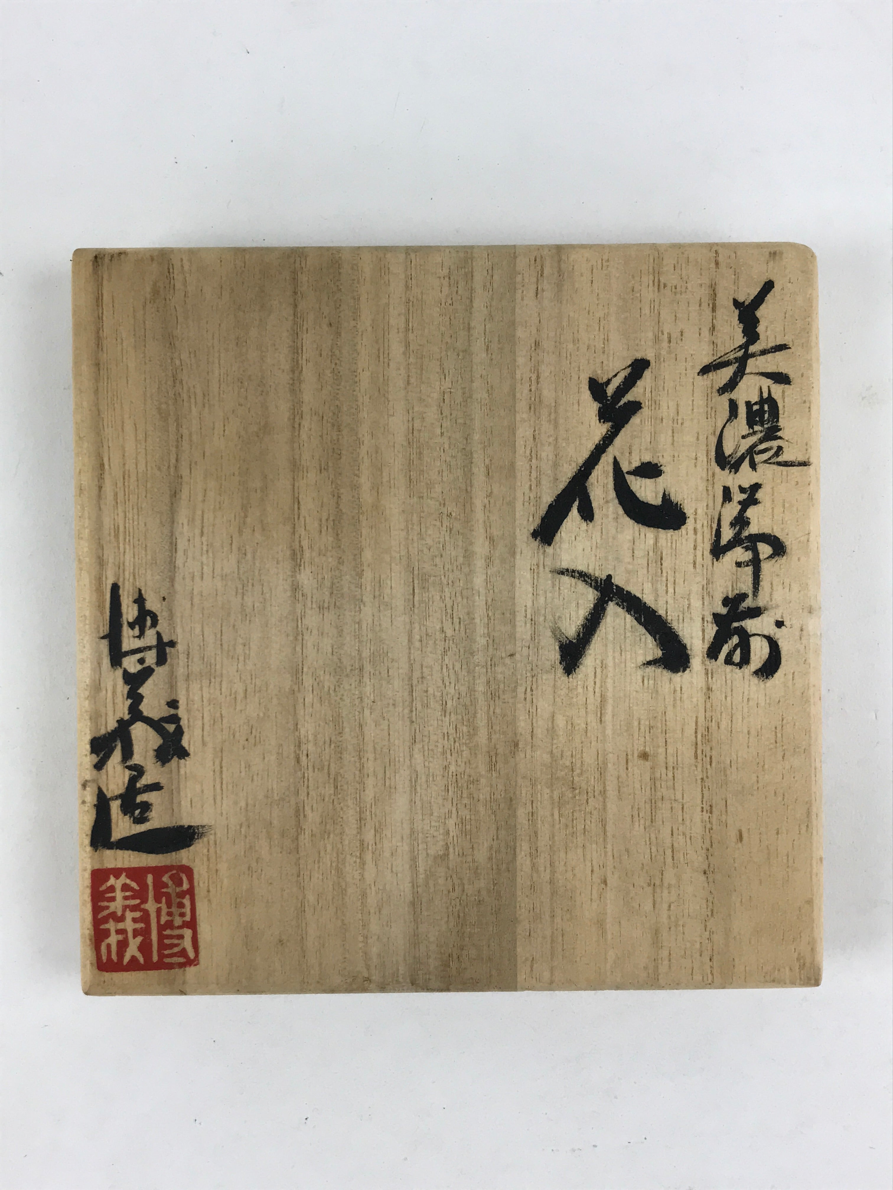 • Kanji on lid: Made by Hiroyoshi (hiroyoshi zo), Mino bizen (specific style of glaze), bizen yaki (style of glaze), Flower vase (hanaire)