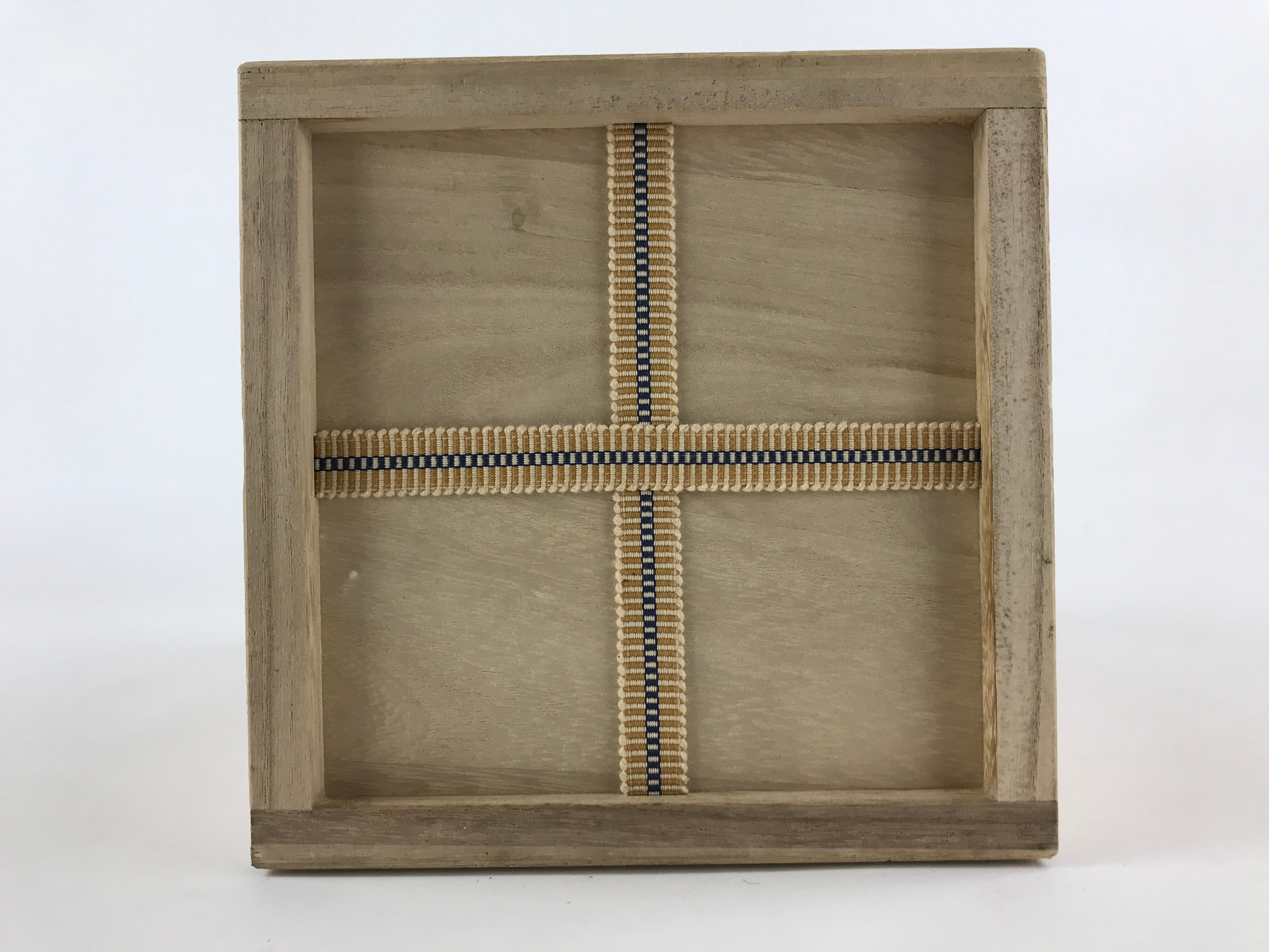 This tall vintage lidded rectangular box is originally made for a triangular flower vase, but is perfect for storing trinkets or use for display or other crafts/projects. It also contains a gold, blue, and white flat cord used for stylishly tying the box shut.