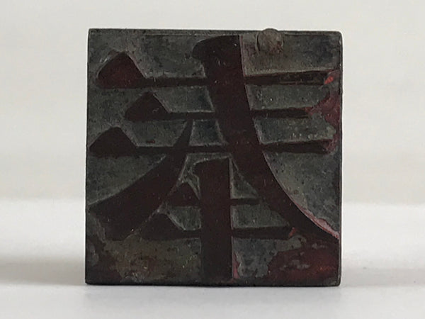 This is a vintage Japanese wood and metal seal for letterpress printing. This single kanji letter (Katsuji) is Tatematsuru (service). The letterpress printing technique is used to produce many copies of books, newspapers, etc.