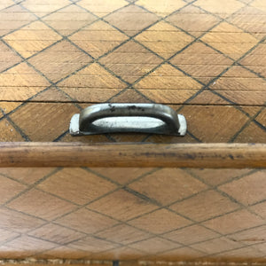 This is a vintage Japanese wooden portable calligraphy box. It is brushed with a clear lacquer and has a checkered design with some small patterned squares reminiscent of yosegi-zaiku puzzle boxes. It has a shutter lid with a small metal handle that rolls back to expose the inside. While the ink stone and other utensils are missing, there are specific cutout spots where they should be placed, including brush rests. There is an inner panel that is removable, likely for cleaning or adjustments. On the very bottom, there is a shallow drawer for paper, extra brushes, cloths, etc.