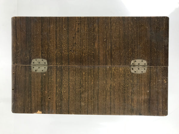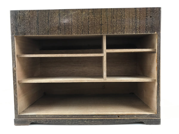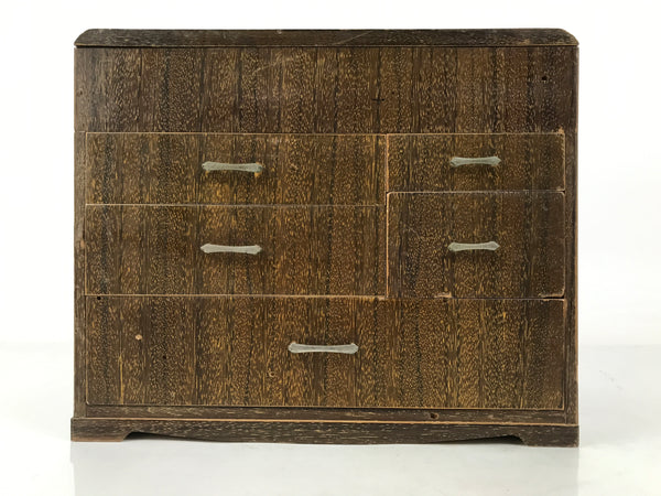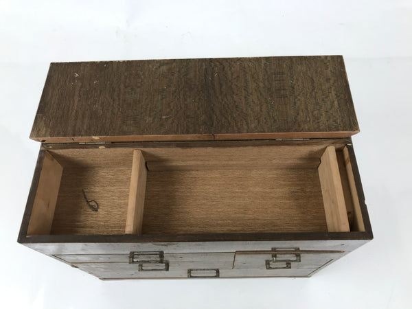 This is a Japanese sewing box, also called Haribako. Finished with a dark brown color, it displays gorgeous natural wood grain. This tansu chest has five differently-sized drawers with simple metal hardware. A panel in the lid opens to reveal two compartments. There is a slot on the right-hand side that was used to store a flat ruler.This beautiful piece can be used for storing sewing supplies, jewelry, or other trinkets.