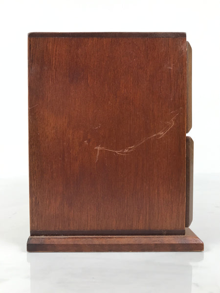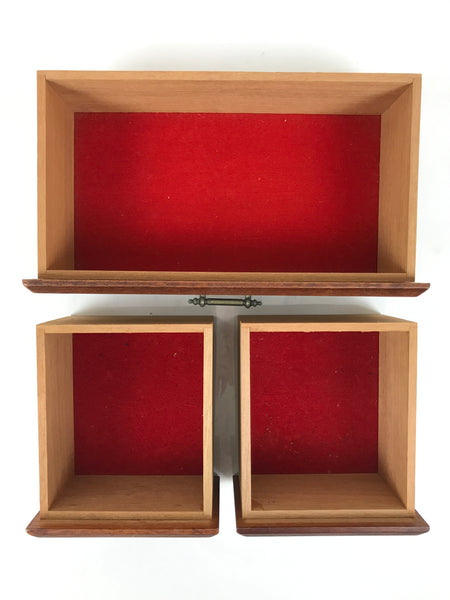 This is a vintage Japanese storage chest, also called tansu. Stained a lovely brown with a clear brushed lacquer finish, this gorgeous chest has three drawers (two smaller, one larger), each with silver-colored metal handle hardware. This tansu chest can be used for storing sewing supplies (as a haribako), jewelry, hobby supplies, or other trinkets.