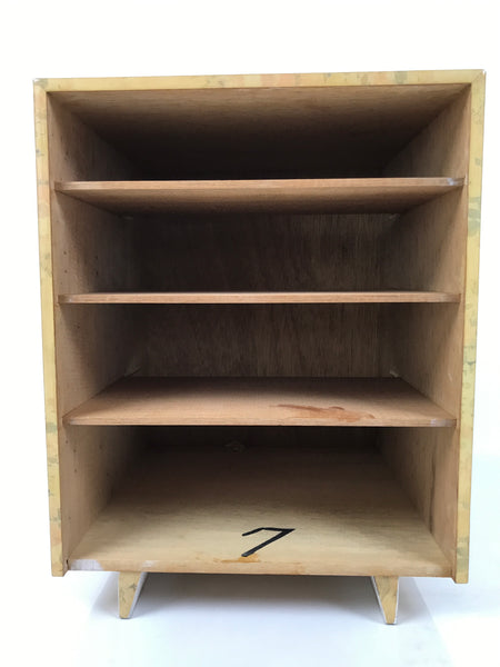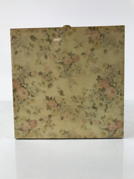 This is a vintage Japanese storage chest, also called tansu. This tansu has four similar-sized drawers with simple metal knobs. It has a layer of decorative floral paper covered with a clear lacquer varnish. This tansu chest can be used for storing sewing supplies (as a haribako), jewelry, hobby supplies, or other trinkets.
