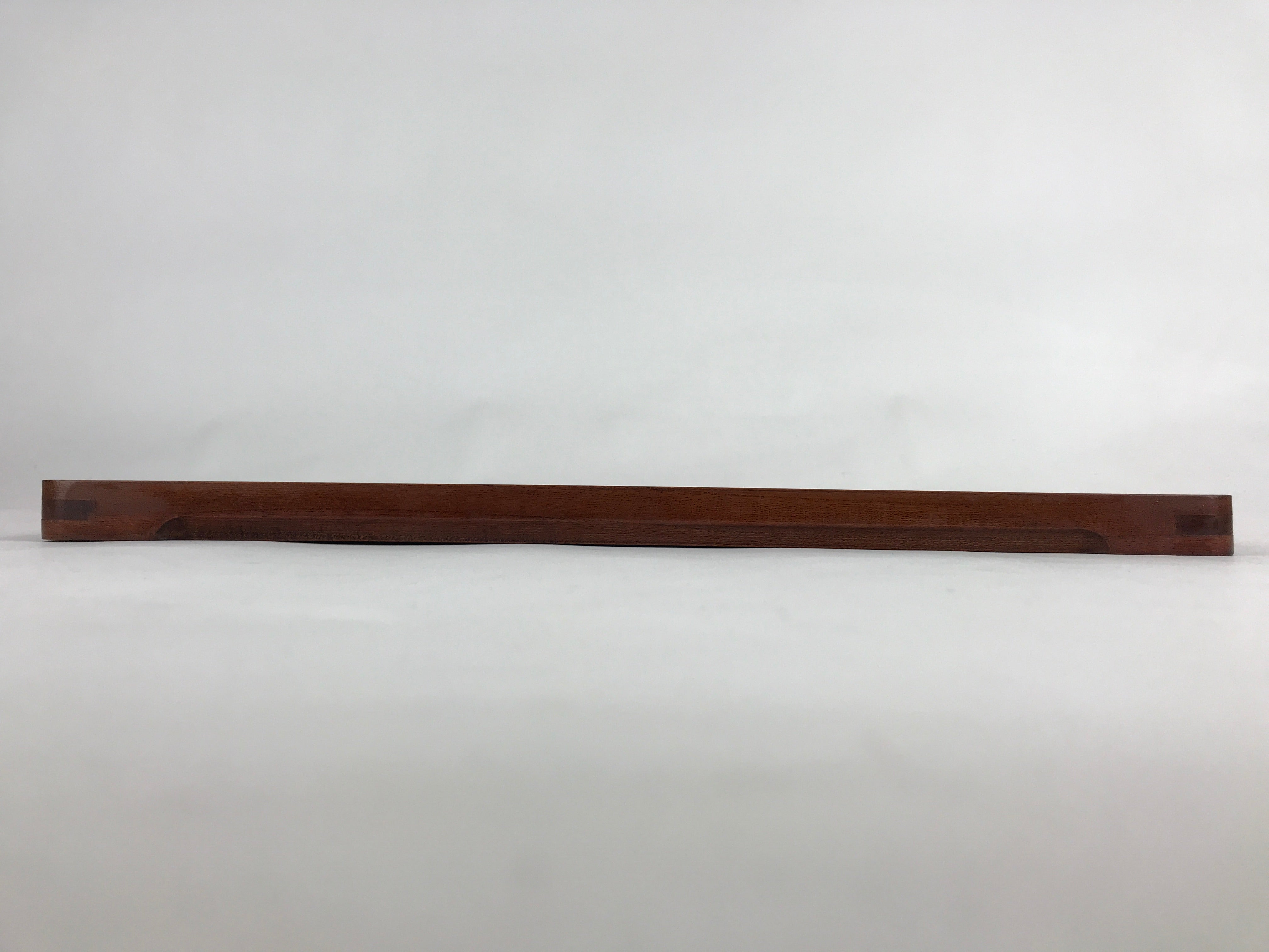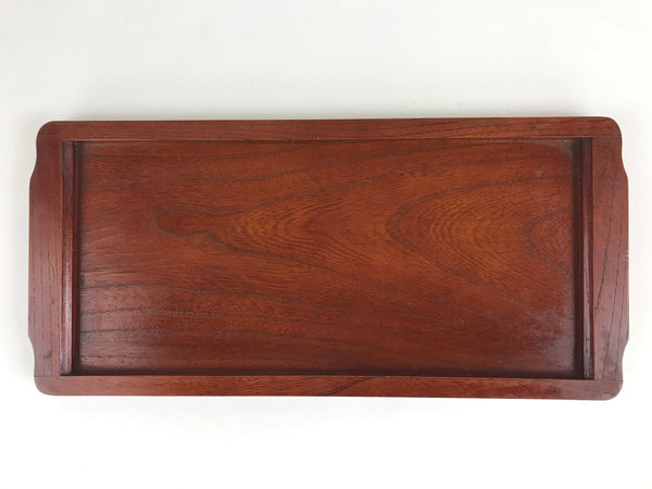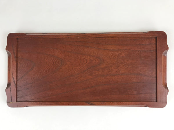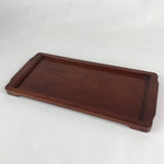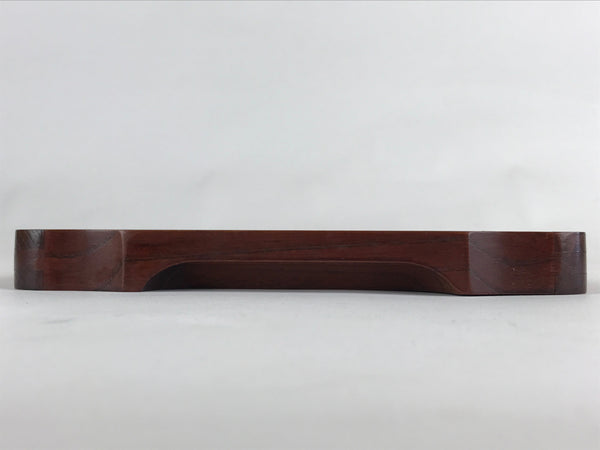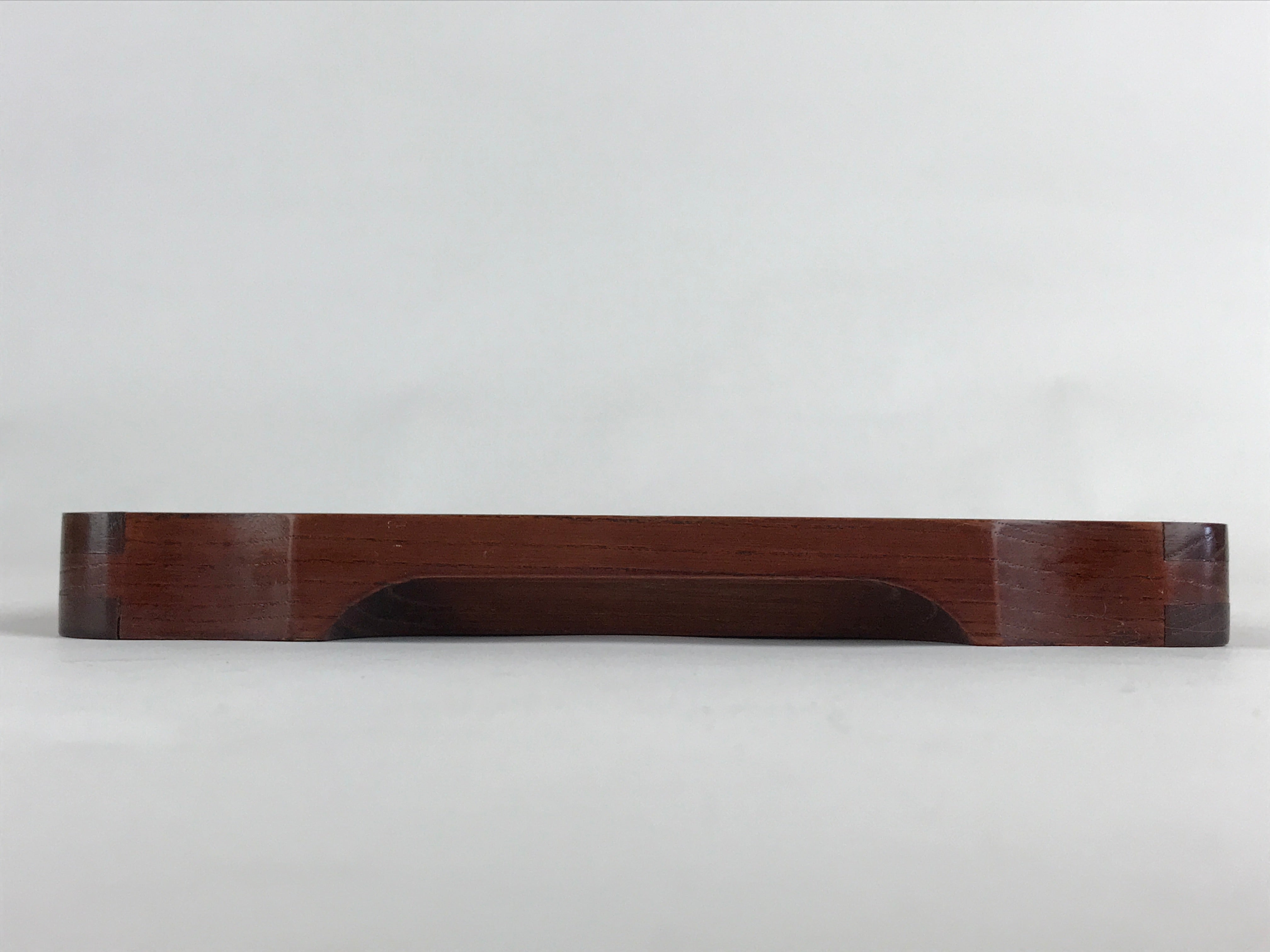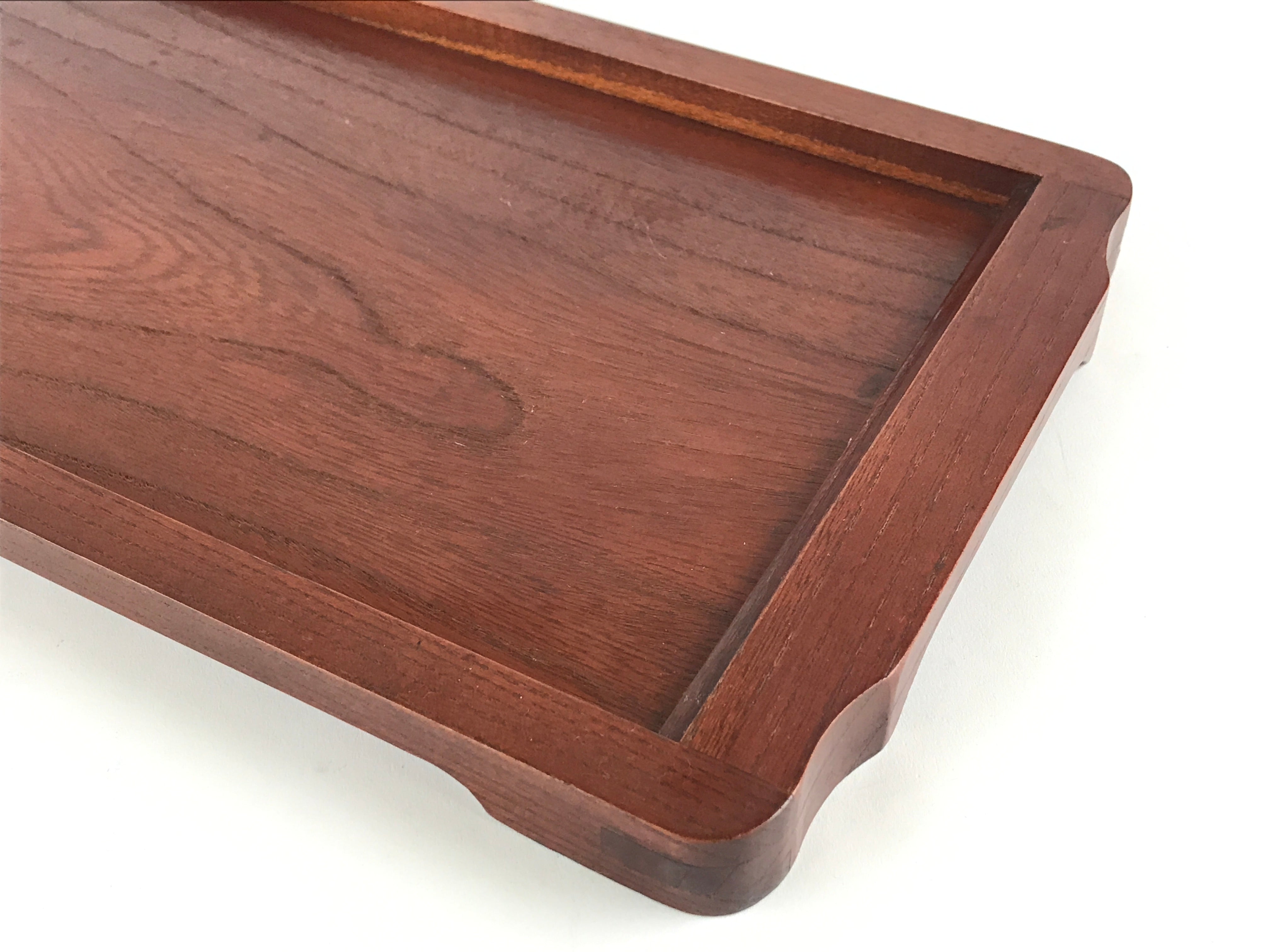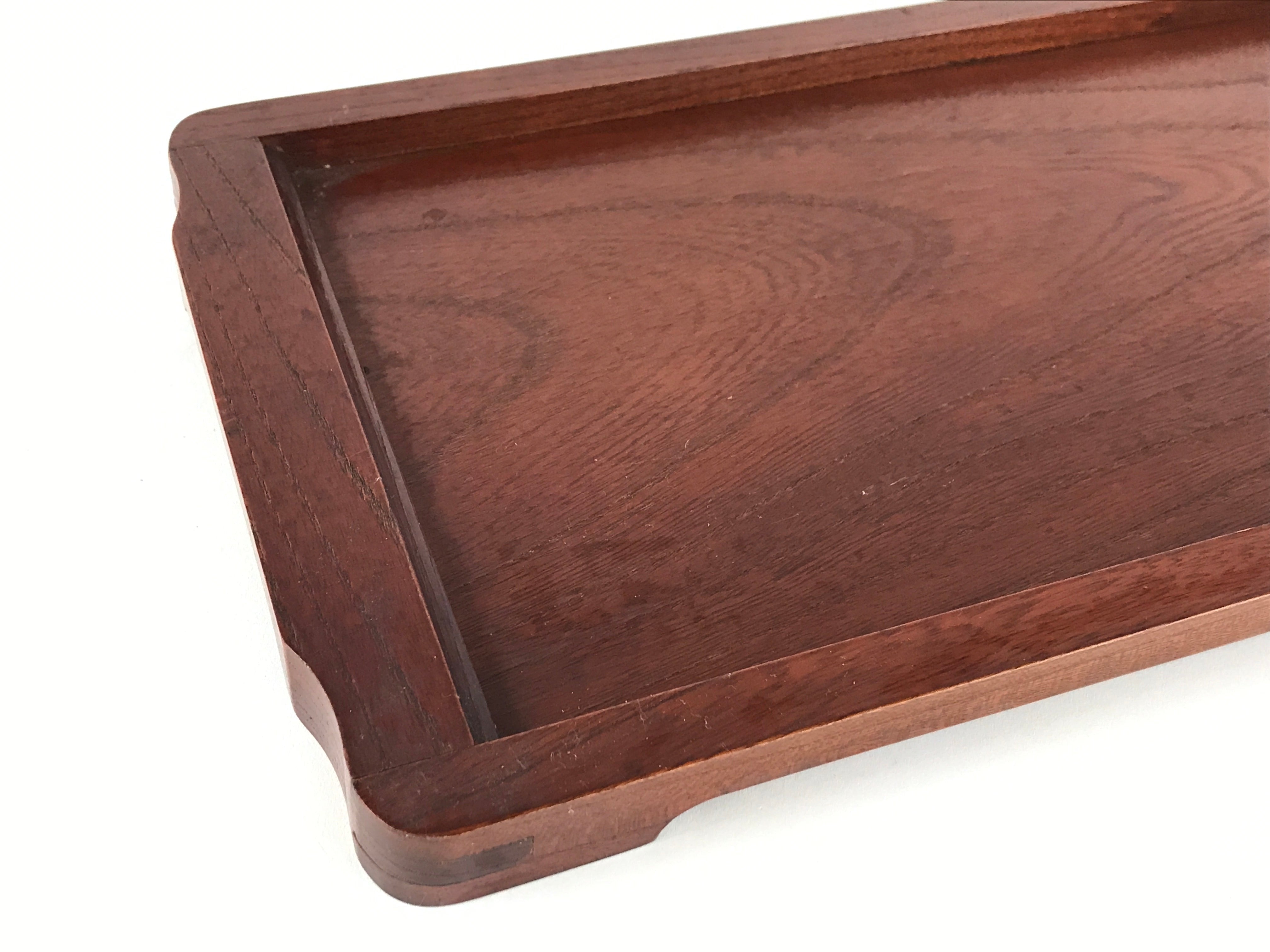 This is a Japanese vintage wooden tray, or Obon, typically used for serving drinks and snacks to guests in one's home, business, etc. A rich dark brown in color with lovely wood grain on display, this shallow and sturdy rectangular tray provides both function and beautiful decor.