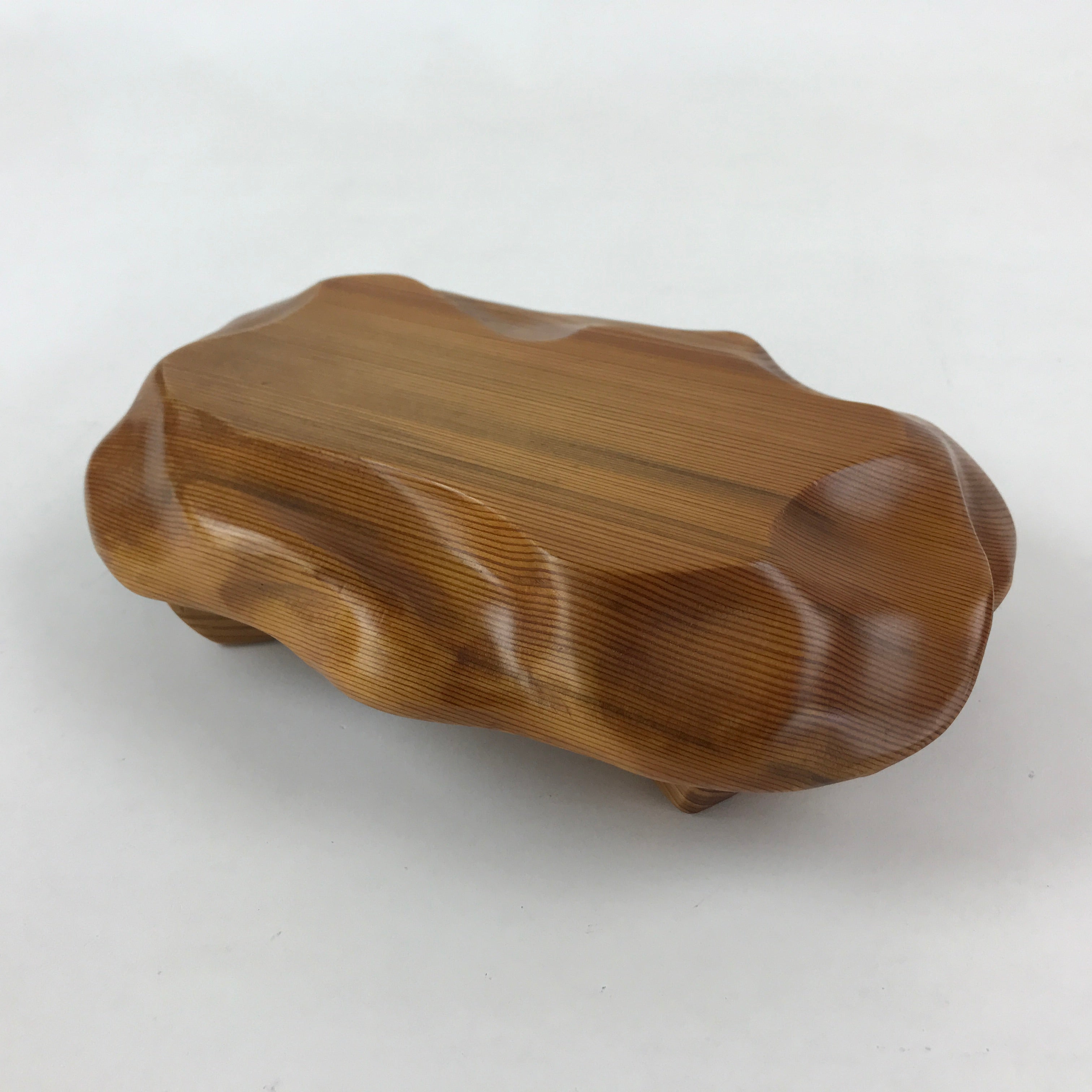 Used for the display of flower vases, ikebana arrangements, bonsai, and more, this small uniquely shaped kadai is one-of-a-kind, handcrafted from a piece of solid wood. The wood's natural knots and grain are accentuated by a medium brown stain and clear varnish. The stand is held up by four sturdy legs and has many different textures on all sides to create visual interest from any angle.