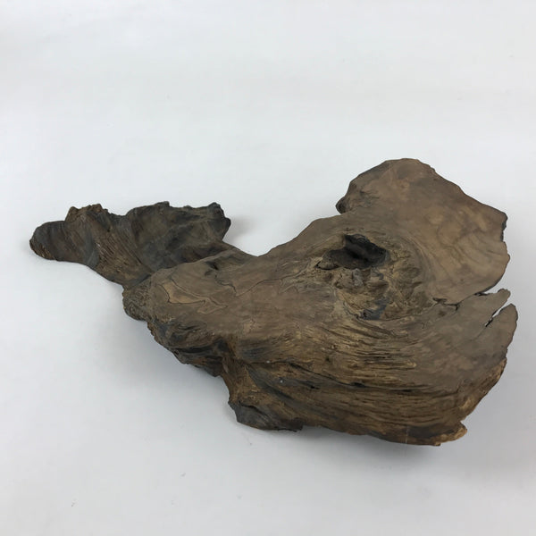 Used for the display of flower vases, ikebana arrangements, bonsai, and more, this uniquely shaped kadai is one-of-a-kind, handcrafted from a piece of solid wood. The wood's natural knots and grain are accentuated by a dark stain and wear from decades of use. The stand has many different textures on all sides to create visual interest from any angle.