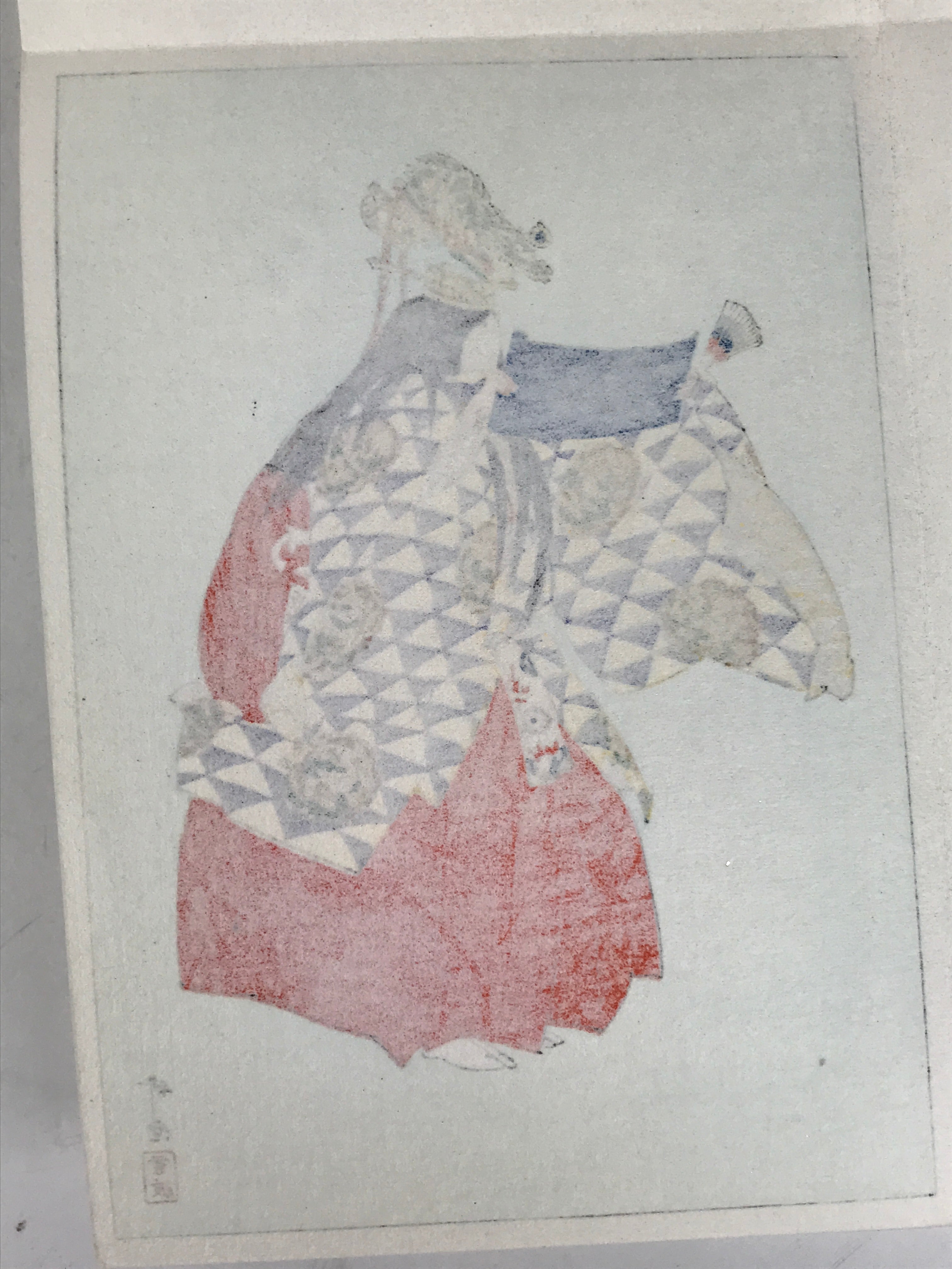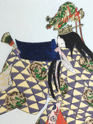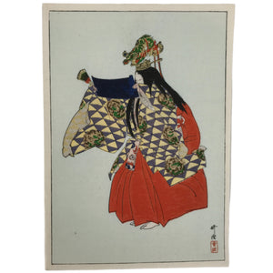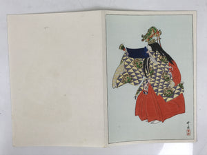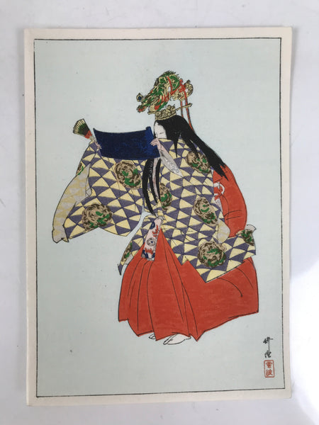 This vintage Japanese writing paper features a colorful woodblock-printed reproduction of an artwork by Kogyo Tsukioka representing a Noh theatre character from the Noh play "Ama". The paper is folded in four.