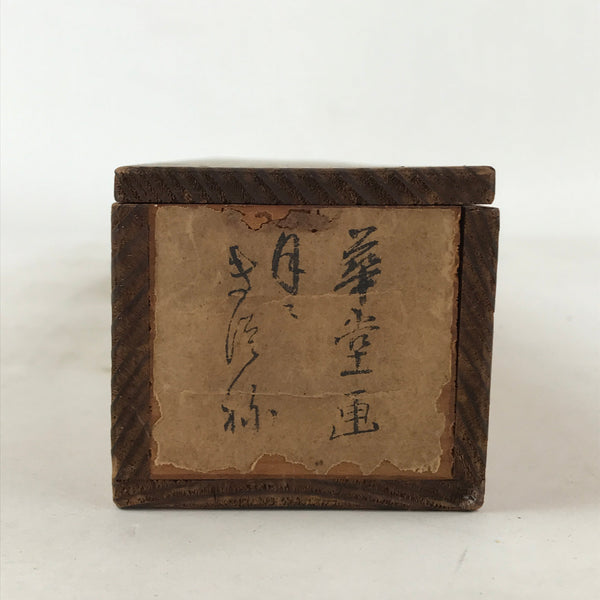 Hand-crafted and in a dark brown color, this sturdy and slender wooden box is made to store a hanging scroll, or kakejiku. The lid is step-top and fits flush on the top. There are some inscriptions on the box and a sticker on the front side.