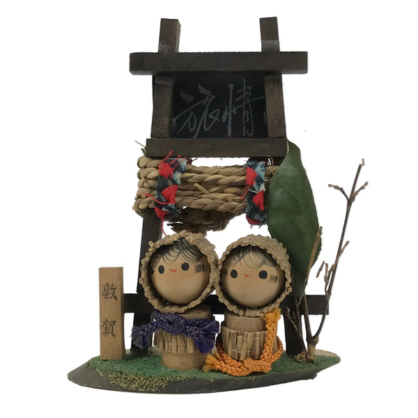This is a vintage Japanese wooden doll figurine from Tsuruga, Fukui. It has two child figurines in a straw snow coat, a shrine-gate-style frame with a straw rope wrapped, and signs with Kanji characters on a wooden base. Half of the front of the base has a textured green surface.