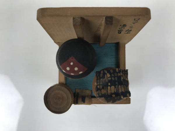 This is a vintage Japanese wooden doll figurine. It represents a girl and a boy taking a bath together. It has a towel on the figurine's head, a washbowl, and a towel on the edge of the bathtub, Japanese Onsen common scenery. Four wooden panels make the bathtub. A blue-painted panel is the hot water, and the round-headed smiling figurines are attached to it. Gold tapes accent the tub and the bowl. There are inscriptions.