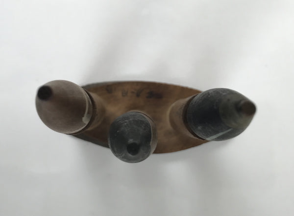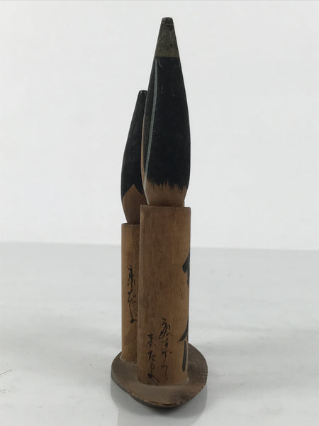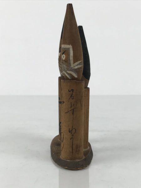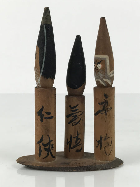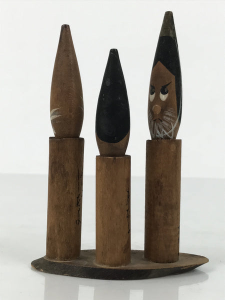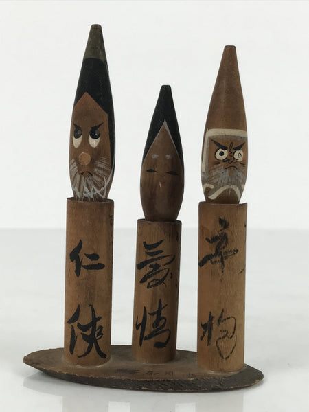 This is a vintage Japanese wooden doll figurine from Unaduki Hot Spring in Toyama. It has three brush-shaped wobbly-head figurines on a wooden stand. Each figurine has a Kanji Japanese word on its body and a facial expression that matches the word's meaning.