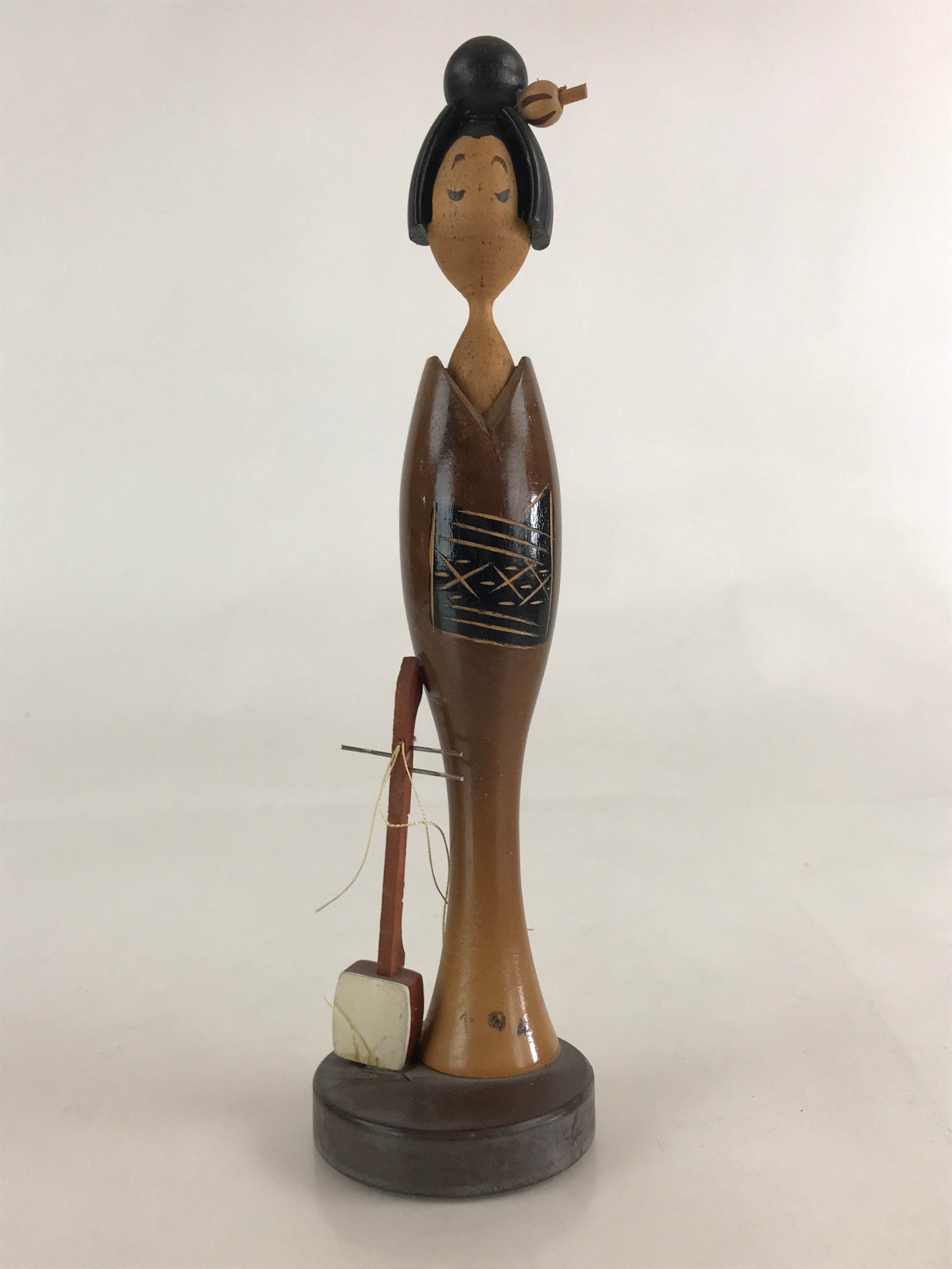 This is a vintage Japanese traditional craft wooden kokeshi doll, figurine. This is a geisha doll standing with Shamisen (Japanese guitar). Kokeshi are simple wooden Japanese dolls with no arms or legs that have been crafted for more than 150 years (the late Edo period) as a toy and amulets for children.