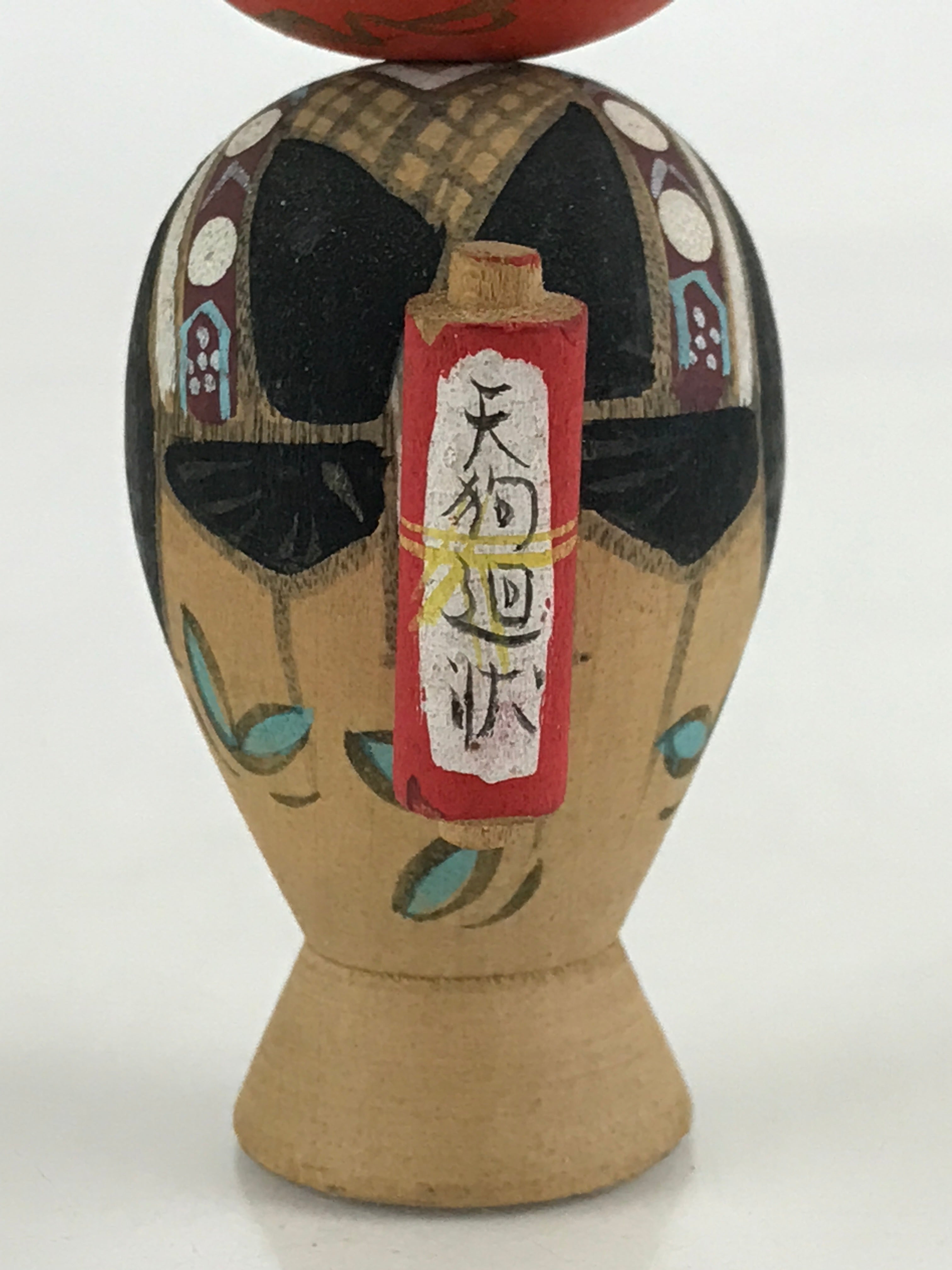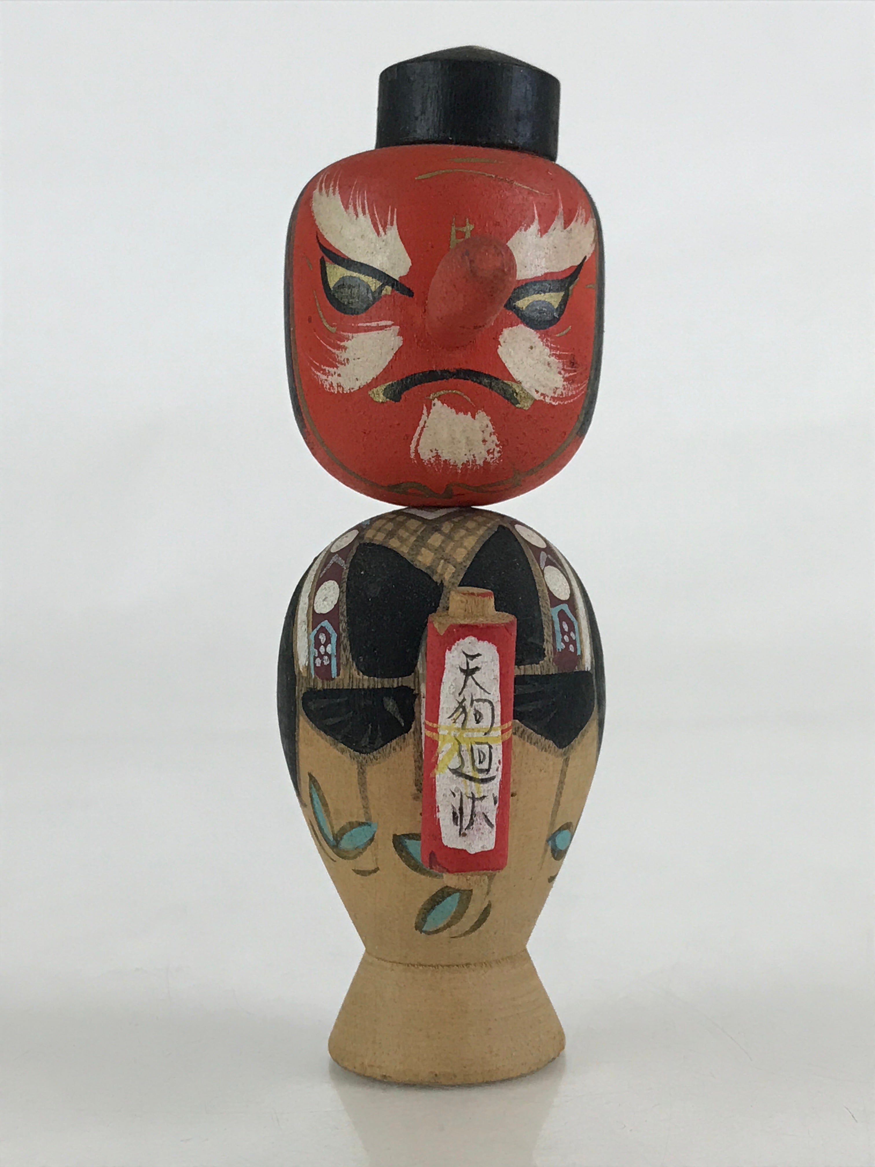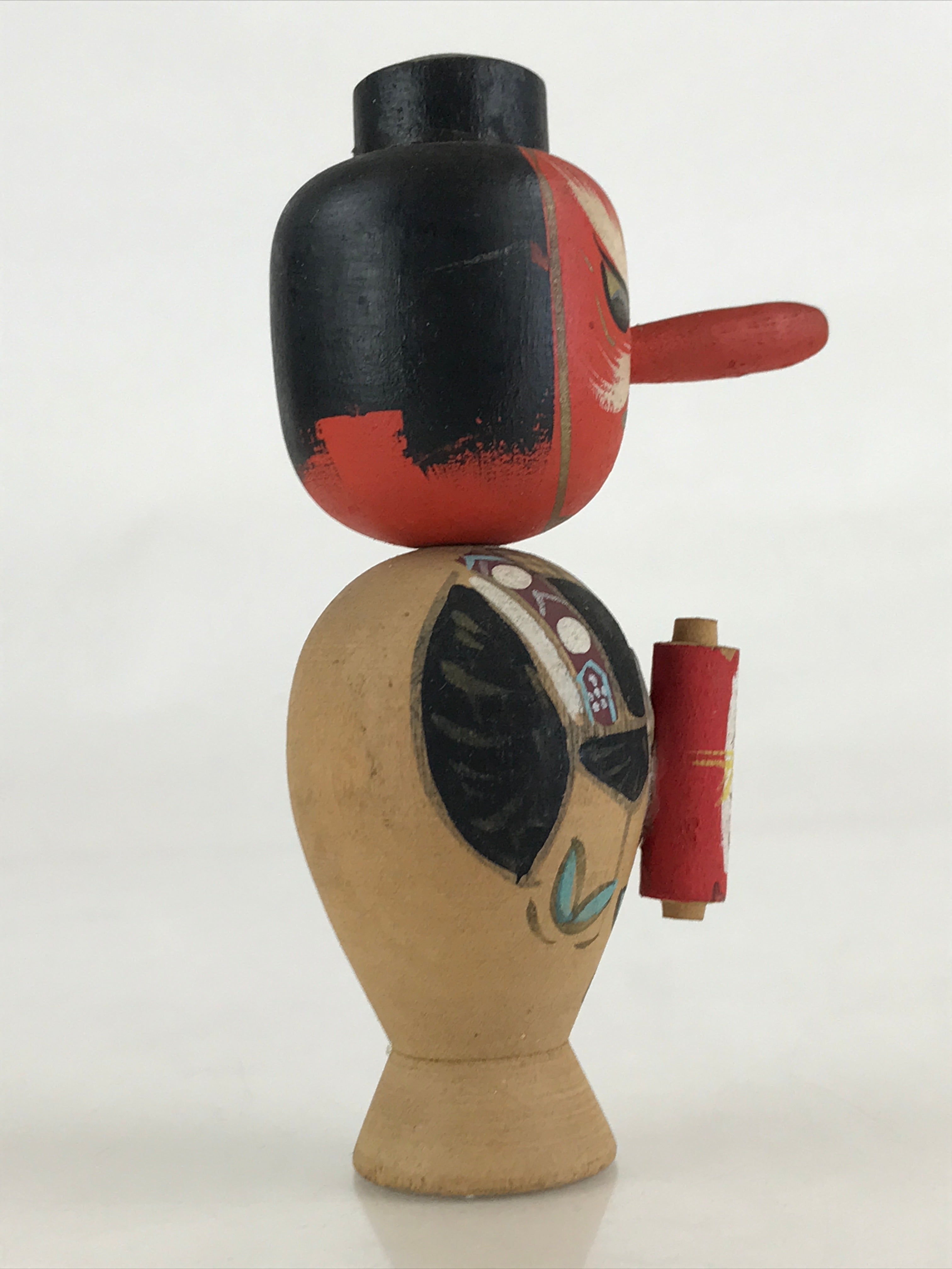 This is a vintage Japanese traditional craft wooden kokeshi doll, figurine. This is Tengu (long-nosed goblin). The face and body are connected by wooden sticks and move wobbly. Kokeshi are simple wooden Japanese dolls with no arms or legs that have been crafted for more than 150 years (the late Edo period) as a toy and amulets for children.