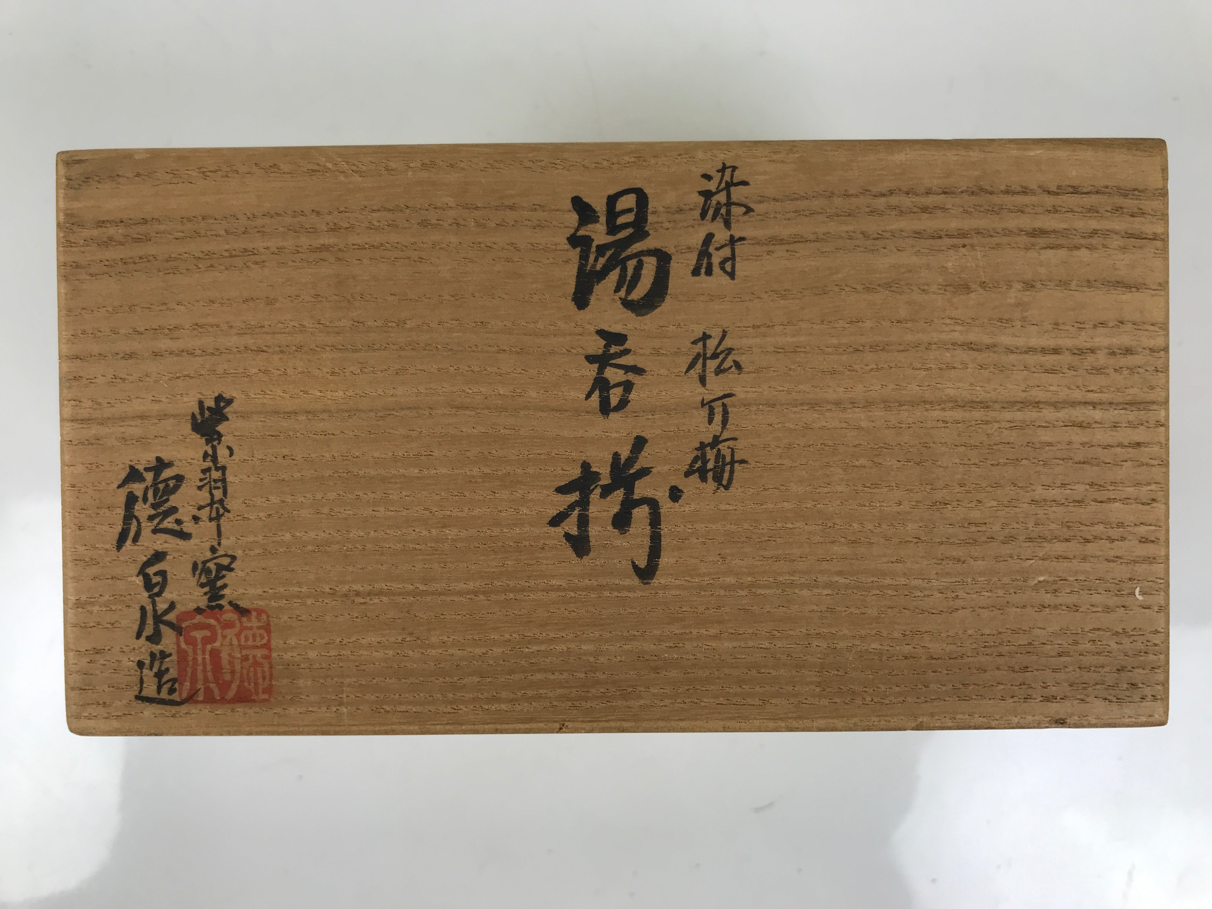 • Characters on the lid: 染付 blue and white, 松竹梅 pine tree,bamboo,and plum blossom design, 湯呑揃 teacup set, 徳泉 potter's name