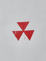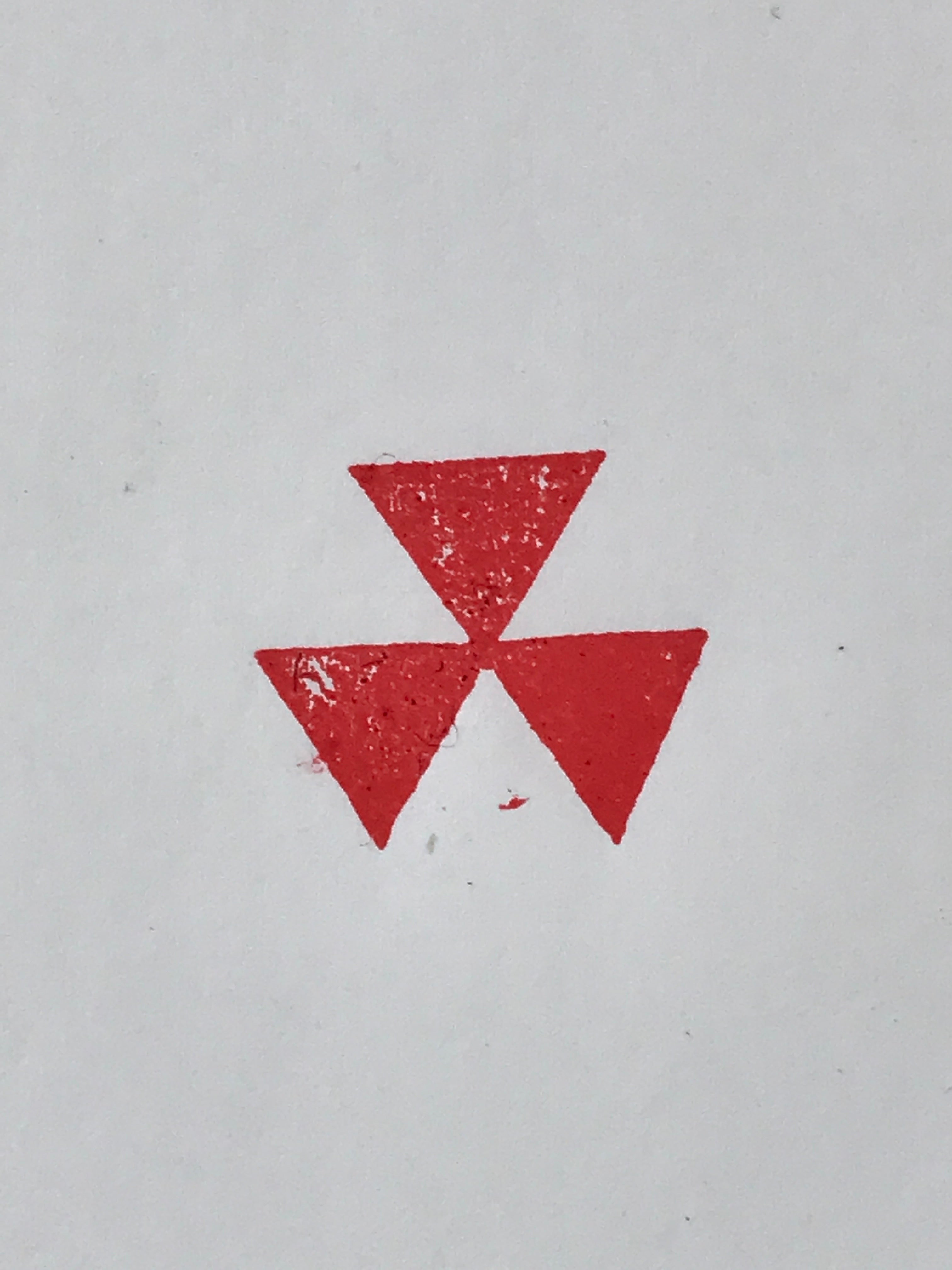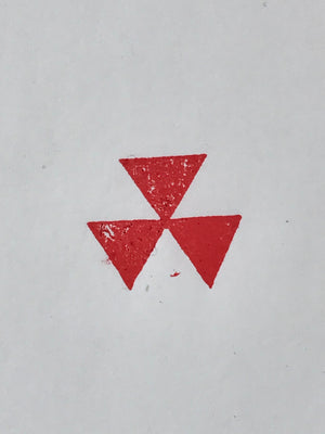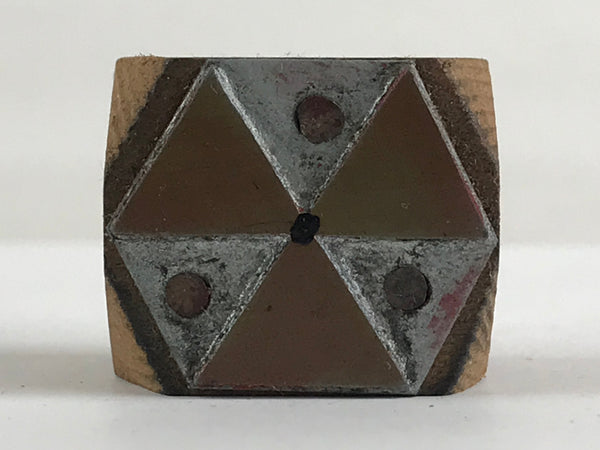 This is a vintage Japanese wooden seal. A metal plate with 3 triangles symbol is attached to the wood. This symbol is Doshisya University's emblem. These three triangles represent Doshisha's educational philosophy of harmony of knowledge, morality, and a healthy body.