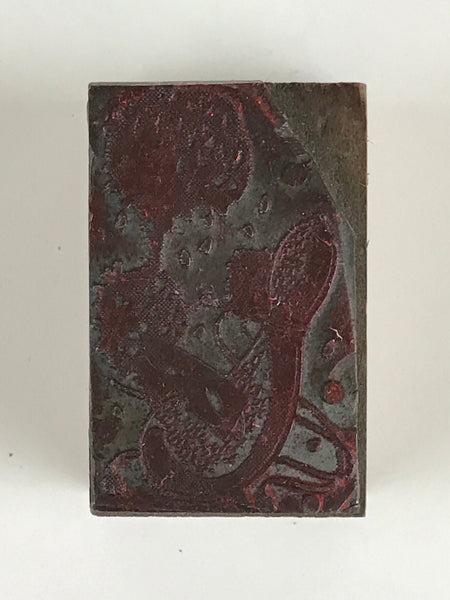 This is a vintage Japanese wooden seal. A metal plate with Hyotan (gourd) and flower is stuck to the wood. It is a stamp with a Japanese design. The metal plate is fixed with three nails.