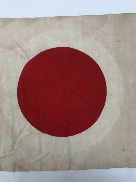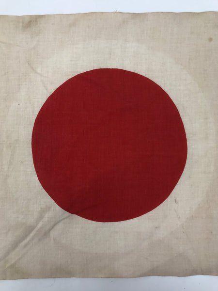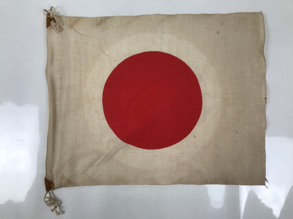This is a vintage Japanese national flag. Called Hinomaru (ball of the sun) or Nisshouki (flag of the sun), this small flag is speculated to have been a WWII aircraft insignia flag due to the subtle white ring around the red sun (though it is heavily faded now). The flag has two reinforced corners with ties for attaching to a pole or rope.
