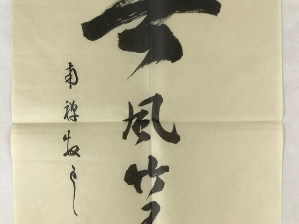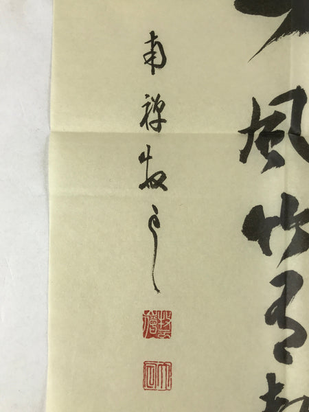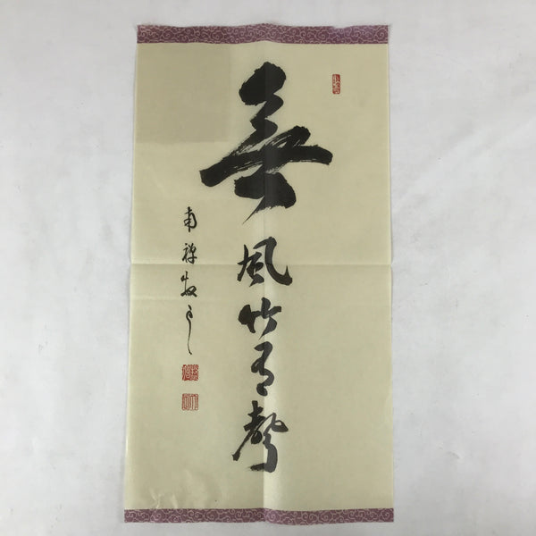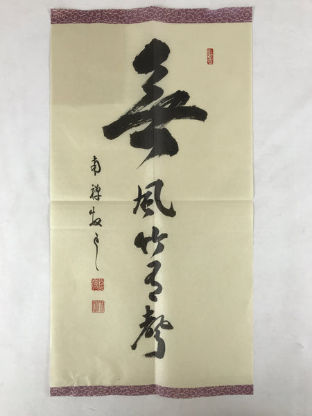 This item is a vintage printed reproduction of calligraphy by Shiozawa Taijo, a Buddhist monk of the Linji School. The calligraphy consists of a poem of 5 characters written vertically: Kazenaushitetakeniueari. The first character is bigger than the others. Some papers with explanations are glued to the back.