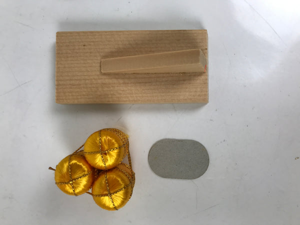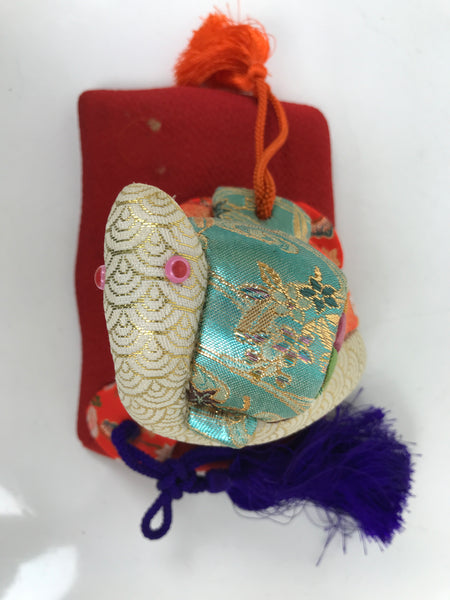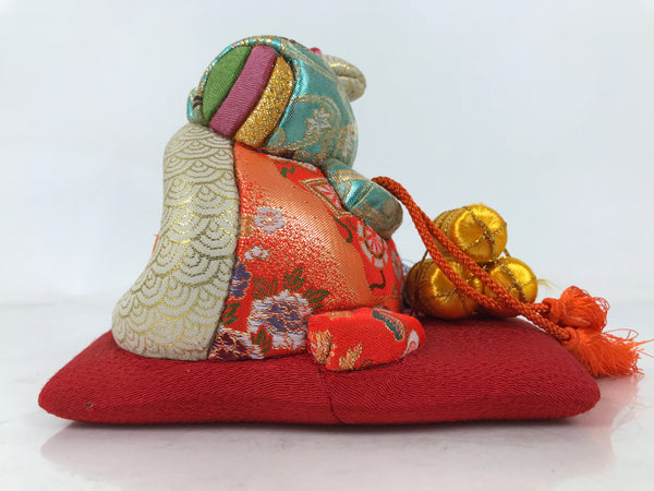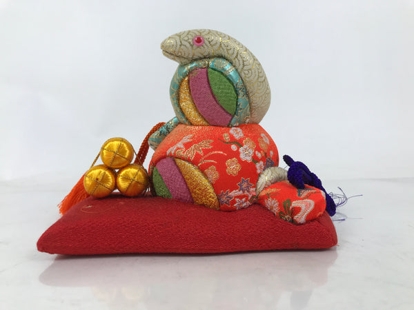 This vintage Japanese Kimekomi decorative figure represents a snake, one of the Chinese zodiac animals, and is a decoration for the new year to wish for ever-increasing success. It has a wooden base with silk fabric applied according to the kimekomi technique. The snake is white with gold lines, and the two lucky hammers, or Uchide no kozuchi, are green and red with beautiful patterns. The snake coils around piled hammers, which makes a lucky decoration to invite fortune. Golden rice barrels, a wooden sign, and a wooden stand are included. It also comes with extra fabric and the original paper box.