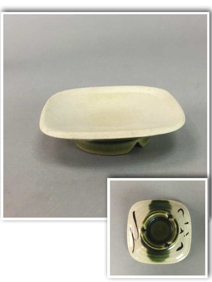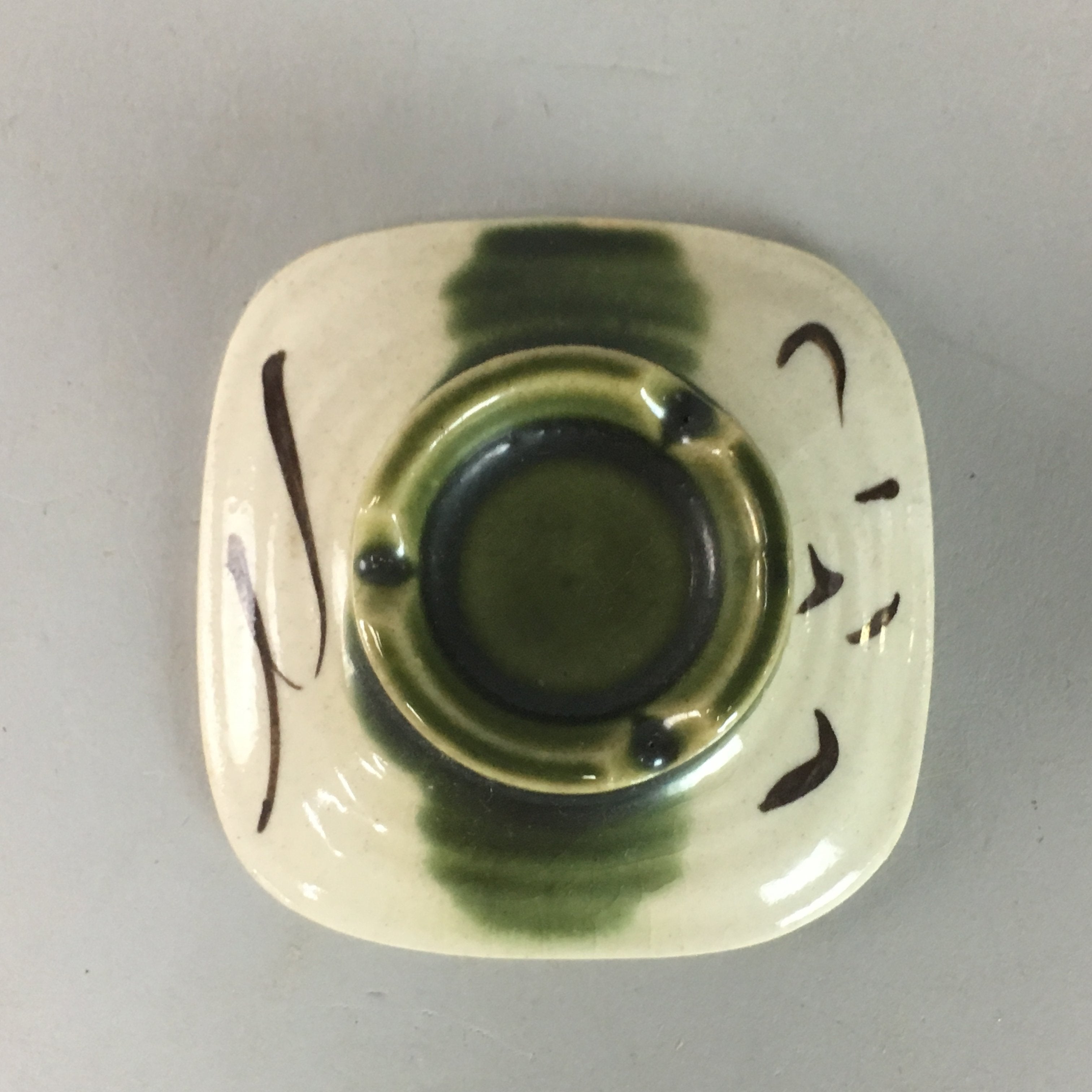 Details: This is a vintage Japanese small plate or Kozara from Japan. This small plate has a hand-painted of green color in the bottom. This is made Oribe ware ceramic pottery. Oribe ware is famous for its green copper glaze, black and bold painted designs. Oribe is one of the oldest Japanese potteries. Japanese small plates like this are used for soy sauce dipping, putting spices or Japanese pickles. This plate will make a great addition to your home, buy today before this one of a kind plate is gone.